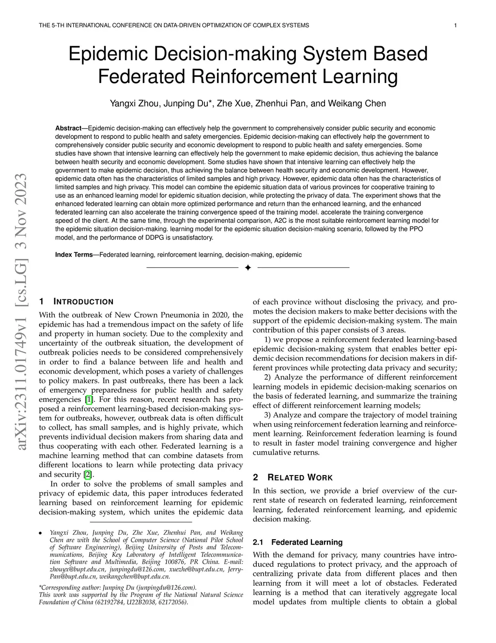 Epidemic decision-making can effectively help the government to comprehensively consider public security and economic development to respond to public health and safety emergencies. Epidemic decision-making can effectively help the government to comprehensively consider public security and economic development to respond to public health and safety emergencies. Some studies have shown that intensive learning can effectively help the government to make epidemic decision, thus achieving the balance between health security and economic development. Some studies have shown that intensive learning can effectively help the government to make epidemic decision, thus achieving the balance between health security and economic development. However, epidemic data often has the characteristics of limited samples and high privacy. However, epidemic data often has the characteristics of limited samples and high privacy. This model can combine the epidemic situation data of various provinces for cooperative training to use as an enhanced learning model for epidemic situation decision, while protecting the privacy of data. The experiment shows that the enhanced federated learning can obtain more optimized performance and return than the enhanced learning, and the enhanced federated learning can also accelerate the training convergence speed of the training model. accelerate the training convergence speed of the client. At the same time, through the experimental comparison, A2C is the most suitable reinforcement learning model for the epidemic situation decision-making. learning model for the epidemic situation decision-making scenario, followed by the PPO model, and the performance of DDPG is unsatisfactory.