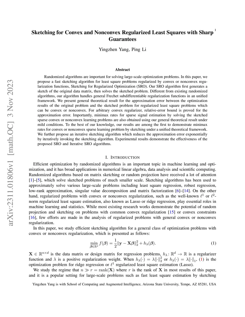 Randomized algorithms are important for solving large-scale optimization problems. In this paper, we propose a fast sketching algorithm for least square problems regularized by convex or nonconvex regularization functions, Sketching for Regularized Optimization (SRO). Our SRO algorithm first generates a sketch of the original data matrix, then solves the sketched problem. Different from existing randomized algorithms, our algorithm handles general Frechet subdifferentiable regularization functions in an unified framework. We present general theoretical result for the approximation error between the optimization results of the original problem and the sketched problem for regularized least square problems which can be convex or nonconvex. For arbitrary convex regularizer, relative-error bound is proved for the approximation error. Importantly, minimax rates for sparse signal estimation by solving the sketched sparse convex or nonconvex learning problems are also obtained using our general theoretical result under mild conditions. To the best of our knowledge, our results are among the first to demonstrate minimax rates for convex or nonconvex sparse learning problem by sketching under a unified theoretical framework. We further propose an iterative sketching algorithm which reduces the approximation error exponentially by iteratively invoking the sketching algorithm. Experimental results demonstrate the effectiveness of the proposed SRO and Iterative SRO algorithms.