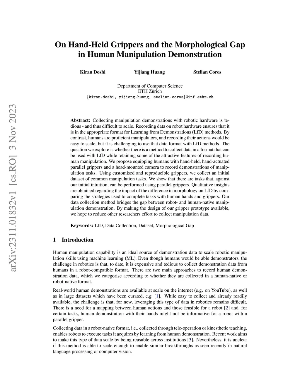 Collecting manipulation demonstrations with robotic hardware is tedious - and thus difficult to scale. Recording data on robot hardware ensures that it is in the appropriate format for Learning from Demonstrations (LfD) methods. By contrast, humans are proficient manipulators, and recording their actions would be easy to scale, but it is challenging to use that data format with LfD methods. The question we explore is whether there is a method to collect data in a format that can be used with LfD while retaining some of the attractive features of recording human manipulation. We propose equipping humans with hand-held, hand-actuated parallel grippers and a head-mounted camera to record demonstrations of manipulation tasks. Using customised and reproducible grippers, we collect an initial dataset of common manipulation tasks. We show that there are tasks that, against our initial intuition, can be performed using parallel grippers. Qualitative insights are obtained regarding the impact of the difference in morphology on LfD by comparing the strategies used to complete tasks with human hands and grippers. Our data collection method bridges the gap between robot- and human-native manipulation demonstration. By making the design of our gripper prototype available, we hope to reduce other researchers effort to collect manipulation data.