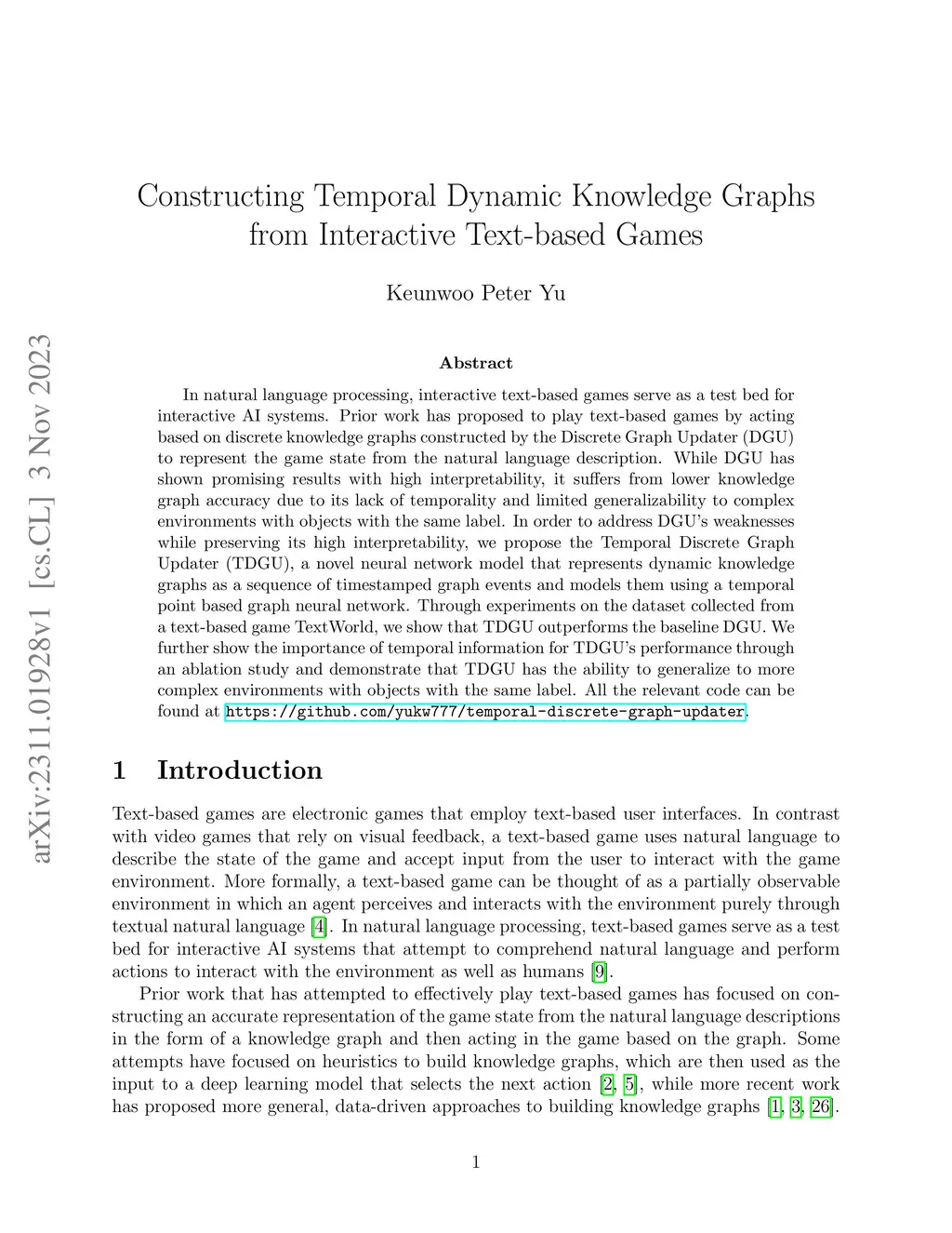 In natural language processing, interactive text-based games serve as a test bed for interactive AI systems. Prior work has proposed to play text-based games by acting based on discrete knowledge graphs constructed by the Discrete Graph Updater (DGU) to represent the game state from the natural language description. While DGU has shown promising results with high interpretability, it suffers from lower knowledge graph accuracy due to its lack of temporality and limited generalizability to complex environments with objects with the same label. In order to address DGU's weaknesses while preserving its high interpretability, we propose the Temporal Discrete Graph Updater (TDGU), a novel neural network model that represents dynamic knowledge graphs as a sequence of timestamped graph events and models them using a temporal point based graph neural network. Through experiments on the dataset collected from a text-based game TextWorld, we show that TDGU outperforms the baseline DGU. We further show the importance of temporal information for TDGU's performance through an ablation study and demonstrate that TDGU has the ability to generalize to more complex environments with objects with the same label. All the relevant code can be found at \url{https://github.com/yukw777/temporal-discrete-graph-updater}.