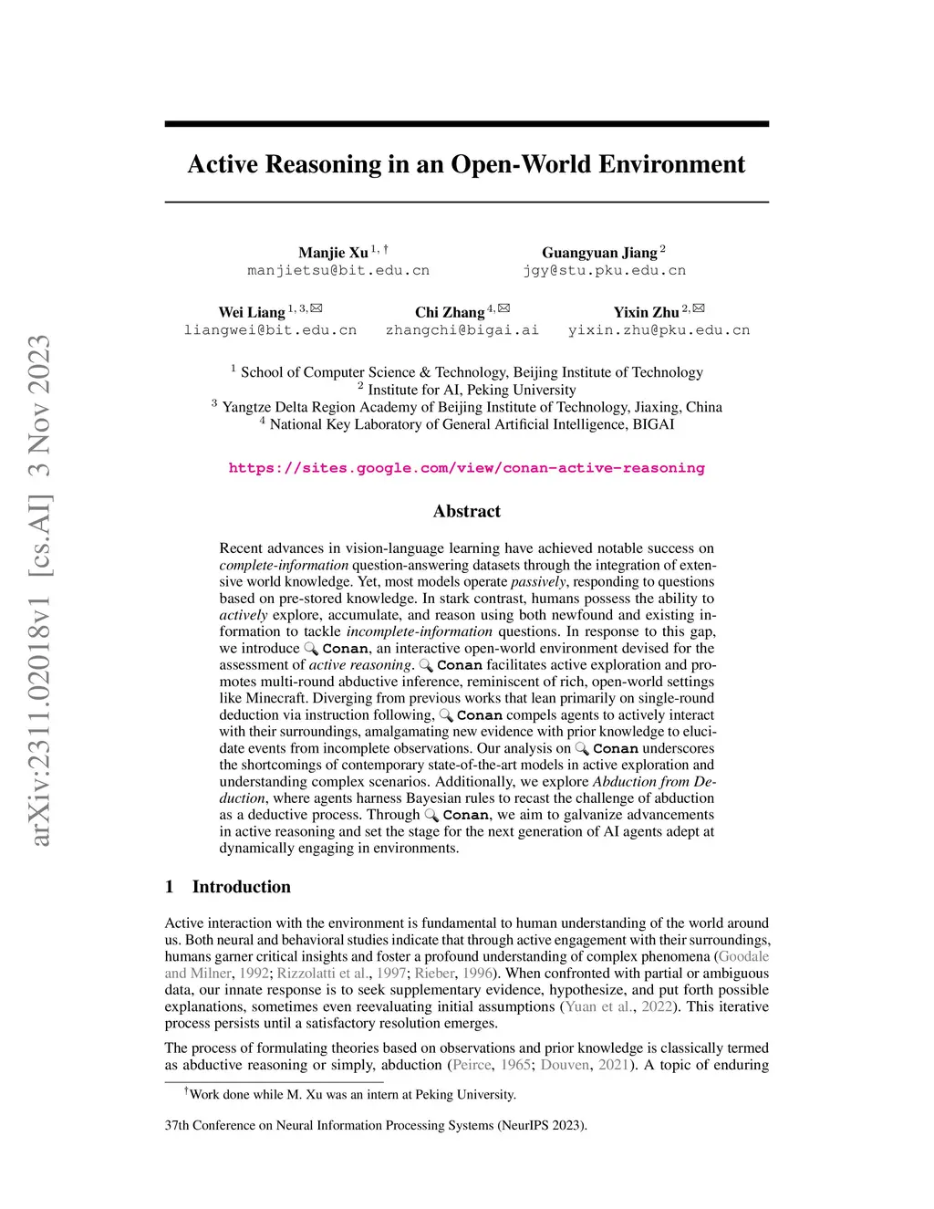 Recent advances in vision-language learning have achieved notable success on complete-information question-answering datasets through the integration of extensive world knowledge. Yet, most models operate passively, responding to questions based on pre-stored knowledge. In stark contrast, humans possess the ability to actively explore, accumulate, and reason using both newfound and existing information to tackle incomplete-information questions. In response to this gap, we introduce , an interactive open-world environment devised for the assessment of active reasoning. facilitates active exploration and promotes multi-round abductive inference, reminiscent of rich, open-world settings like Minecraft. Diverging from previous works that lean primarily on single-round deduction via instruction following, compels agents to actively interact with their surroundings, amalgamating new evidence with prior knowledge to elucidate events from incomplete observations. Our analysis on underscores the shortcomings of contemporary state-of-the-art models in active exploration and understanding complex scenarios. Additionally, we explore Abduction from Deduction, where agents harness Bayesian rules to recast the challenge of abduction as a deductive process. Through , we aim to galvanize advancements in active reasoning and set the stage for the next generation of artificial intelligence agents adept at dynamically engaging in environments.