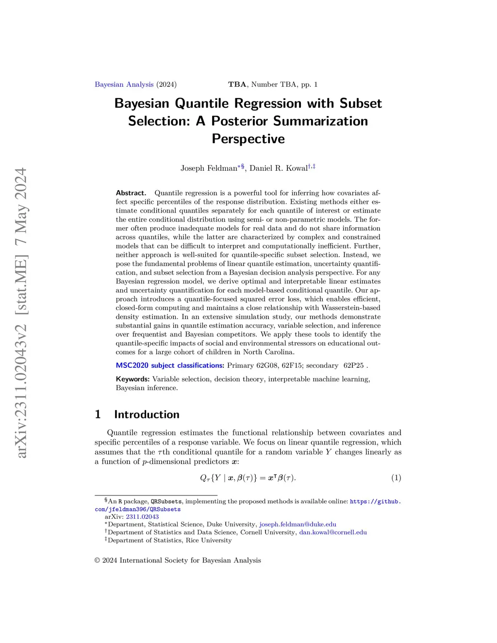 Quantile regression is a powerful tool for inferring how covariates affect specific percentiles of the response distribution. Existing methods either estimate conditional quantiles separately for each quantile of interest or estimate the entire conditional distribution using semi- or non-parametric models. The former often produce inadequate models for real data and do not share information across quantiles, while the latter are characterized by complex and constrained models that can be difficult to interpret and computationally inefficient. Further, neither approach is well-suited for quantile-specific subset selection. Instead, we pose the fundamental problems of linear quantile estimation, uncertainty quantification, and subset selection from a Bayesian decision analysis perspective. For any Bayesian regression model, we derive optimal and interpretable linear estimates and uncertainty quantification for each model-based conditional quantile. Our approach introduces a quantile-focused squared error loss, which enables efficient, closed-form computing and maintains a close relationship with Wasserstein-based density estimation. In an extensive simulation study, our methods demonstrate substantial gains in quantile estimation accuracy, variable selection, and inference over frequentist and Bayesian competitors. We apply these tools to identify the quantile-specific impacts of social and environmental stressors on educational outcomes for a large cohort of children in North Carolina.
