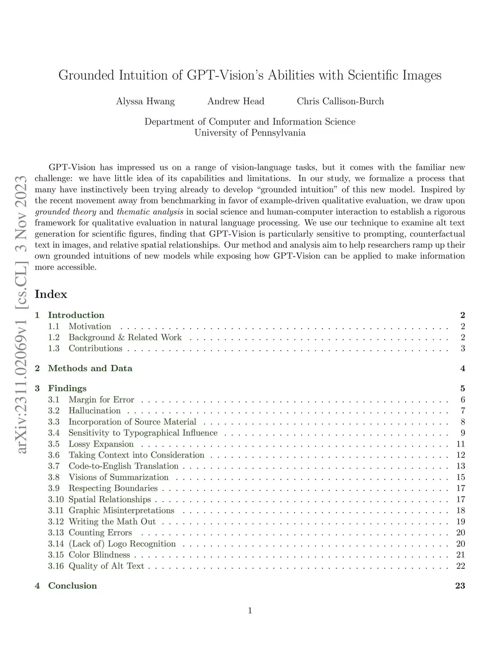 GPT-Vision has impressed us on a range of vision-language tasks, but it comes with the familiar new challenge: we have little idea of its capabilities and limitations. In our study, we formalize a process that many have instinctively been trying already to develop "grounded intuition" of this new model. Inspired by the recent movement away from benchmarking in favor of example-driven qualitative evaluation, we draw upon grounded theory and thematic analysis in social science and human-computer interaction to establish a rigorous framework for qualitative evaluation in natural language processing. We use our technique to examine alt text generation for scientific figures, finding that GPT-Vision is particularly sensitive to prompting, counterfactual text in images, and relative spatial relationships. Our method and analysis aim to help researchers ramp up their own grounded intuitions of new models while exposing how GPT-Vision can be applied to make information more accessible.