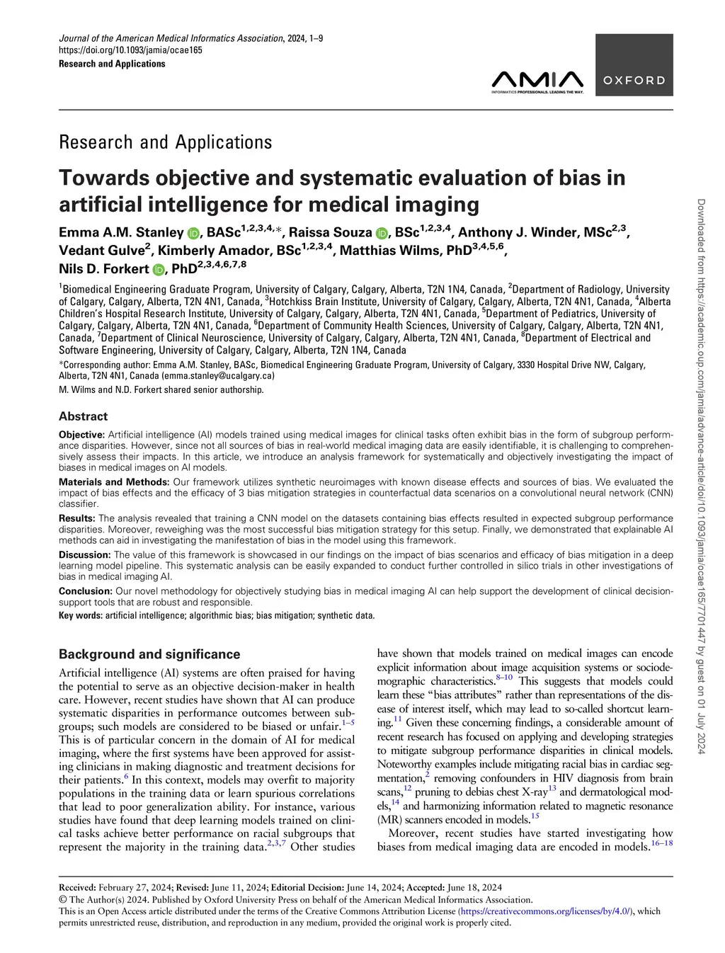 Artificial intelligence (AI) models trained using medical images for clinical tasks often exhibit bias in the form of disparities in performance between subgroups. Since not all sources of biases in real-world medical imaging data are easily identifiable, it is challenging to comprehensively assess how those biases are encoded in models, and how capable bias mitigation methods are at ameliorating performance disparities. In this article, we introduce a novel analysis framework for systematically and objectively investigating the impact of biases in medical images on AI models. We developed and tested this framework for conducting controlled in silico trials to assess bias in medical imaging AI using a tool for generating synthetic magnetic resonance images with known disease effects and sources of bias. The feasibility is showcased by using three counterfactual bias scenarios to measure the impact of simulated bias effects on a convolutional neural network (CNN) classifier and the efficacy of three bias mitigation strategies. The analysis revealed that the simulated biases resulted in expected subgroup performance disparities when the CNN was trained on the synthetic datasets. Moreover, reweighing was identified as the most successful bias mitigation strategy for this setup, and we demonstrated how explainable AI methods can aid in investigating the manifestation of bias in the model using this framework. Developing fair AI models is a considerable challenge given that many and often unknown sources of biases can be present in medical imaging datasets. In this work, we present a novel methodology to objectively study the impact of biases and mitigation strategies on deep learning pipelines, which can support the development of clinical AI that is robust and responsible.