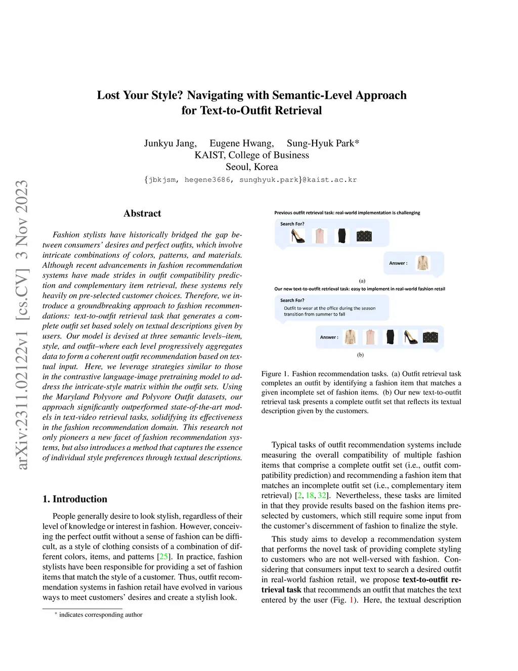 Fashion stylists have historically bridged the gap between consumers' desires and perfect outfits, which involve intricate combinations of colors, patterns, and materials. Although recent advancements in fashion recommendation systems have made strides in outfit compatibility prediction and complementary item retrieval, these systems rely heavily on pre-selected customer choices. Therefore, we introduce a groundbreaking approach to fashion recommendations: text-to-outfit retrieval task that generates a complete outfit set based solely on textual descriptions given by users. Our model is devised at three semantic levels-item, style, and outfit-where each level progressively aggregates data to form a coherent outfit recommendation based on textual input. Here, we leverage strategies similar to those in the contrastive language-image pretraining model to address the intricate-style matrix within the outfit sets. Using the Maryland Polyvore and Polyvore Outfit datasets, our approach significantly outperformed state-of-the-art models in text-video retrieval tasks, solidifying its effectiveness in the fashion recommendation domain. This research not only pioneers a new facet of fashion recommendation systems, but also introduces a method that captures the essence of individual style preferences through textual descriptions.