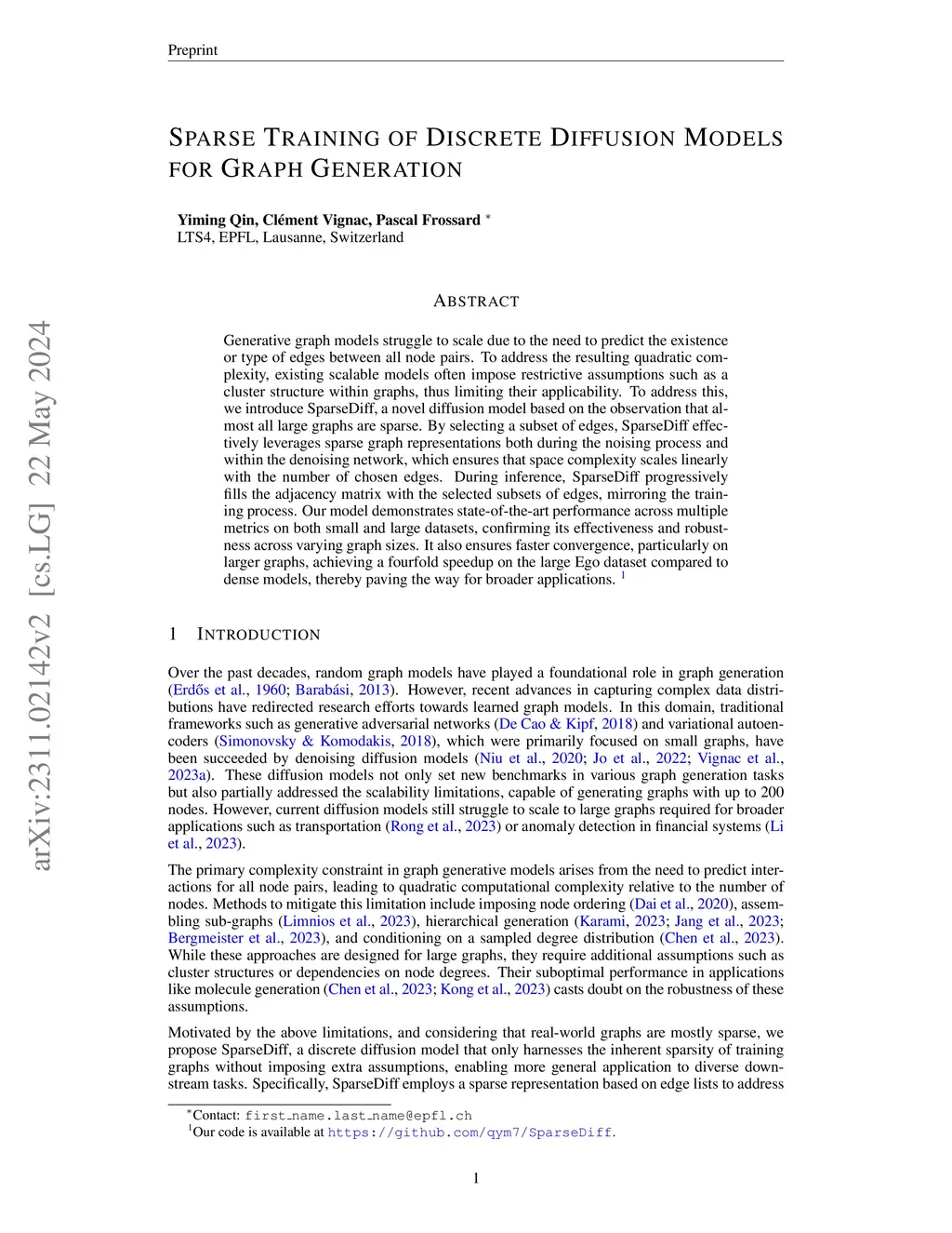 Generative graph models struggle to scale due to the need to predict the existence or type of edges between all node pairs. To address the resulting quadratic complexity, existing scalable models often impose restrictive assumptions such as a cluster structure within graphs, thus limiting their applicability. To address this, we introduce SparseDiff, a novel diffusion model based on the observation that almost all large graphs are sparse. By selecting a subset of edges, SparseDiff effectively leverages sparse graph representations both during the noising process and within the denoising network, which ensures that space complexity scales linearly with the number of chosen edges. During inference, SparseDiff progressively fills the adjacency matrix with the selected subsets of edges, mirroring the training process. Our model demonstrates state-of-the-art performance across multiple metrics on both small and large datasets, confirming its effectiveness and robustness across varying graph sizes. It also ensures faster convergence, particularly on larger graphs, achieving a fourfold speedup on the large Ego dataset compared to dense models, thereby paving the way for broader applications.