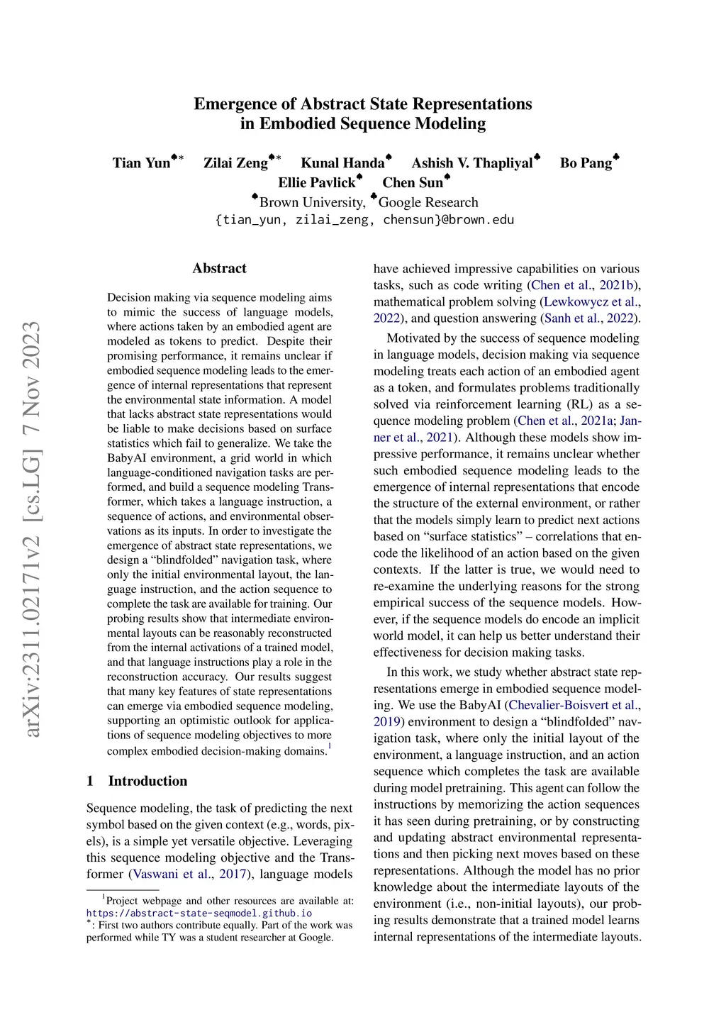 Emergence of Abstract State Representations in Embodied Sequence