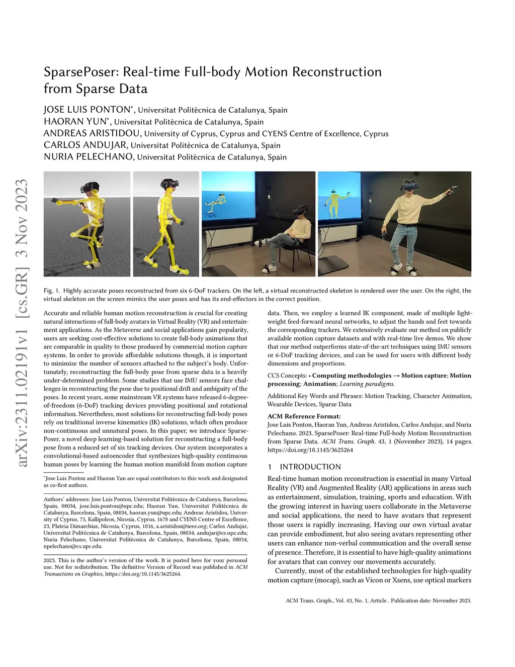 Accurate and reliable human motion reconstruction is crucial for creating natural interactions of full-body avatars in Virtual Reality (VR) and entertainment applications. As the Metaverse and social applications gain popularity, users are seeking cost-effective solutions to create full-body animations that are comparable in quality to those produced by commercial motion capture systems. In order to provide affordable solutions, though, it is important to minimize the number of sensors attached to the subject's body. Unfortunately, reconstructing the full-body pose from sparse data is a heavily under-determined problem. Some studies that use IMU sensors face challenges in reconstructing the pose due to positional drift and ambiguity of the poses. In recent years, some mainstream VR systems have released 6-degree-of-freedom (6-DoF) tracking devices providing positional and rotational information. Nevertheless, most solutions for reconstructing full-body poses rely on traditional inverse kinematics (IK) solutions, which often produce non-continuous and unnatural poses. In this article, we introduce SparsePoser, a novel deep learning-based solution for reconstructing a full-body pose from a reduced set of six tracking devices. Our system incorporates a convolutional-based autoencoder that synthesizes high-quality continuous human poses by learning the human motion manifold from motion capture data. Then, we employ a learned IK component, made of multiple lightweight feed-forward neural networks, to adjust the hands and feet toward the corresponding trackers. We extensively evaluate our method on publicly available motion capture datasets and with real-time live demos. We show that our method outperforms state-of-the-art techniques using IMU sensors or 6-DoF tracking devices, and can be used for users with different body dimensions and proportions.