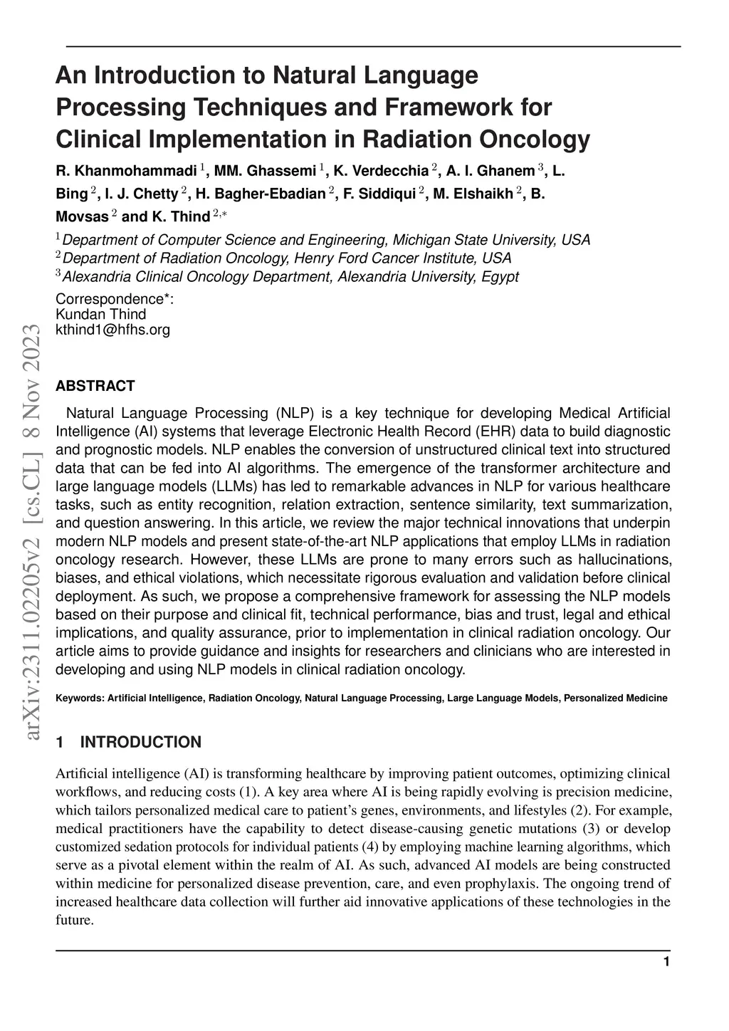 Natural Language Processing (NLP) is a key technique for developing Medical Artificial Intelligence (AI) systems that leverage Electronic Health Record (EHR) data to build diagnostic and prognostic models. NLP enables the conversion of unstructured clinical text into structured data that can be fed into AI algorithms. The emergence of the transformer architecture and large language models (LLMs) has led to remarkable advances in NLP for various healthcare tasks, such as entity recognition, relation extraction, sentence similarity, text summarization, and question answering. In this article, we review the major technical innovations that underpin modern NLP models and present state-of-the-art NLP applications that employ LLMs in radiation oncology research. However, these LLMs are prone to many errors such as hallucinations, biases, and ethical violations, which necessitate rigorous evaluation and validation before clinical deployment. As such, we propose a comprehensive framework for assessing the NLP models based on their purpose and clinical fit, technical performance, bias and trust, legal and ethical implications, and quality assurance, prior to implementation in clinical radiation oncology. Our article aims to provide guidance and insights for researchers and clinicians who are interested in developing and using NLP models in clinical radiation oncology.