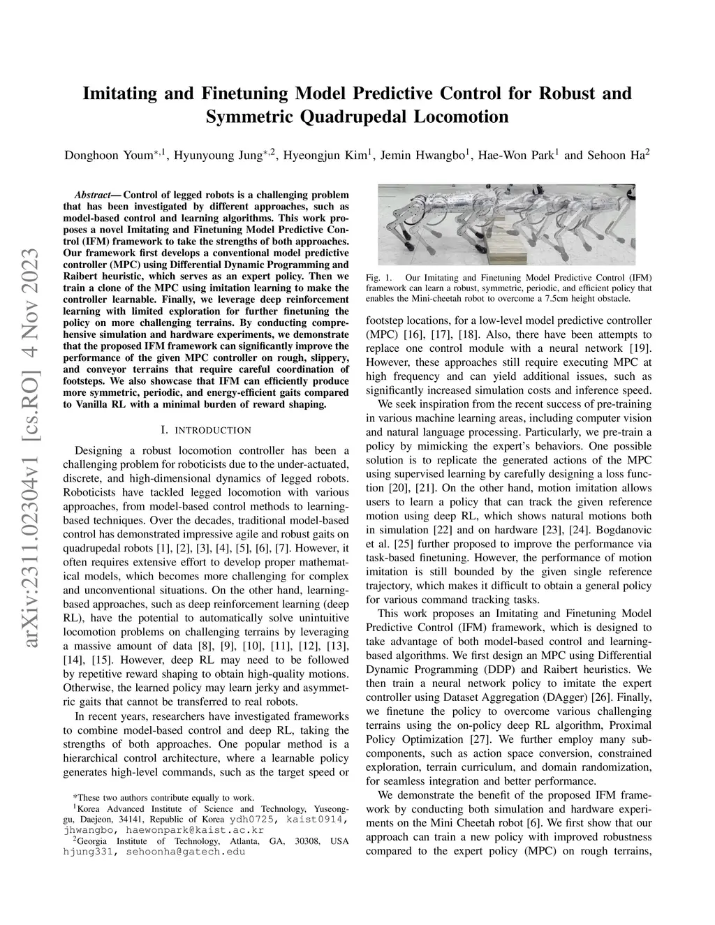 Control of legged robots is a challenging problem that has been investigated by different approaches, such as model-based control and learning algorithms. This work proposes a novel Imitating and Finetuning Model Predictive Control (IFM) framework to take the strengths of both approaches. Our framework first develops a conventional model predictive controller (MPC) using Differential Dynamic Programming and Raibert heuristic, which serves as an expert policy. Then we train a clone of the MPC using imitation learning to make the controller learnable. Finally, we leverage deep reinforcement learning with limited exploration for further finetuning the policy on more challenging terrains. By conducting comprehensive simulation and hardware experiments, we demonstrate that the proposed IFM framework can significantly improve the performance of the given MPC controller on rough, slippery, and conveyor terrains that require careful coordination of footsteps. We also showcase that IFM can efficiently produce more symmetric, periodic, and energy-efficient gaits compared to Vanilla RL with a minimal burden of reward shaping.