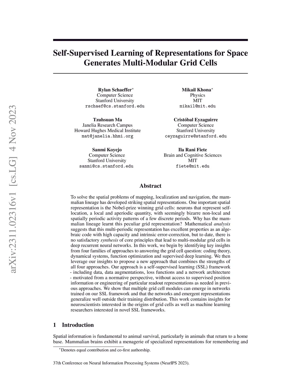 To solve the spatial problems of mapping, localization and navigation, the mammalian lineage has developed striking spatial representations. One important spatial representation is the Nobel-prize winning grid cells: neurons that represent self-location, a local and aperiodic quantity, with seemingly bizarre non-local and spatially periodic activity patterns of a few discrete periods. Why has the mammalian lineage learnt this peculiar grid representation? Mathematical analysis suggests that this multi-periodic representation has excellent properties as an algebraic code with high capacity and intrinsic error-correction, but to date, there is no satisfactory synthesis of core principles that lead to multi-modular grid cells in deep recurrent neural networks. In this work, we begin by identifying key insights from four families of approaches to answering the grid cell question: coding theory, dynamical systems, function optimization and supervised deep learning. We then leverage our insights to propose a new approach that combines the strengths of all four approaches. Our approach is a self-supervised learning (SSL) framework - including data, data augmentations, loss functions and a network architecture - motivated from a normative perspective, without access to supervised position information or engineering of particular readout representations as needed in previous approaches. We show that multiple grid cell modules can emerge in networks trained on our SSL framework and that the networks and emergent representations generalize well outside their training distribution. This work contains insights for neuroscientists interested in the origins of grid cells as well as machine learning researchers interested in novel SSL frameworks.