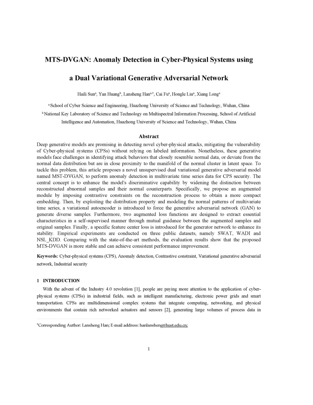 MTS-DVGAN: Anomaly Detection in Cyber-Physical Systems using a Dual