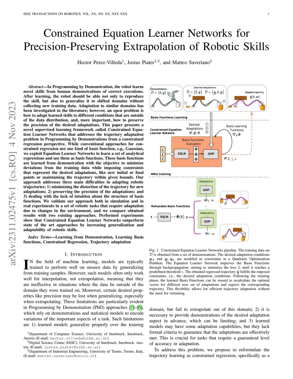 In Programming by Demonstration, the robot learns novel skills from human demonstrations. After learning, the robot should be able not only to reproduce the skill, but also to generalize it to shifted domains without collecting new training data. Adaptation to similar domains has been investigated in the literature; however, an open problem is how to adapt learned skills to different conditions that are outside of the data distribution, and, more important, how to preserve the precision of the desired adaptations. This paper presents a novel supervised learning framework called Constrained Equation Learner Networks that addresses the trajectory adaptation problem in Programming by Demonstrations from a constrained regression perspective. While conventional approaches for constrained regression use one kind of basis function, e.g., Gaussian, we exploit Equation Learner Networks to learn a set of analytical expressions and use them as basis functions. These basis functions are learned from demonstration with the objective to minimize deviations from the training data while imposing constraints that represent the desired adaptations, like new initial or final points or maintaining the trajectory within given bounds. Our approach addresses three main difficulties in adapting robotic trajectories: 1) minimizing the distortion of the trajectory for new adaptations; 2) preserving the precision of the adaptations; and 3) dealing with the lack of intuition about the structure of basis functions. We validate our approach both in simulation and in real experiments in a set of robotic tasks that require adaptation due to changes in the environment, and we compare obtained results with two existing approaches. Performed experiments show that Constrained Equation Learner Networks outperform state of the art approaches by increasing generalization and adaptability of robotic skills.
