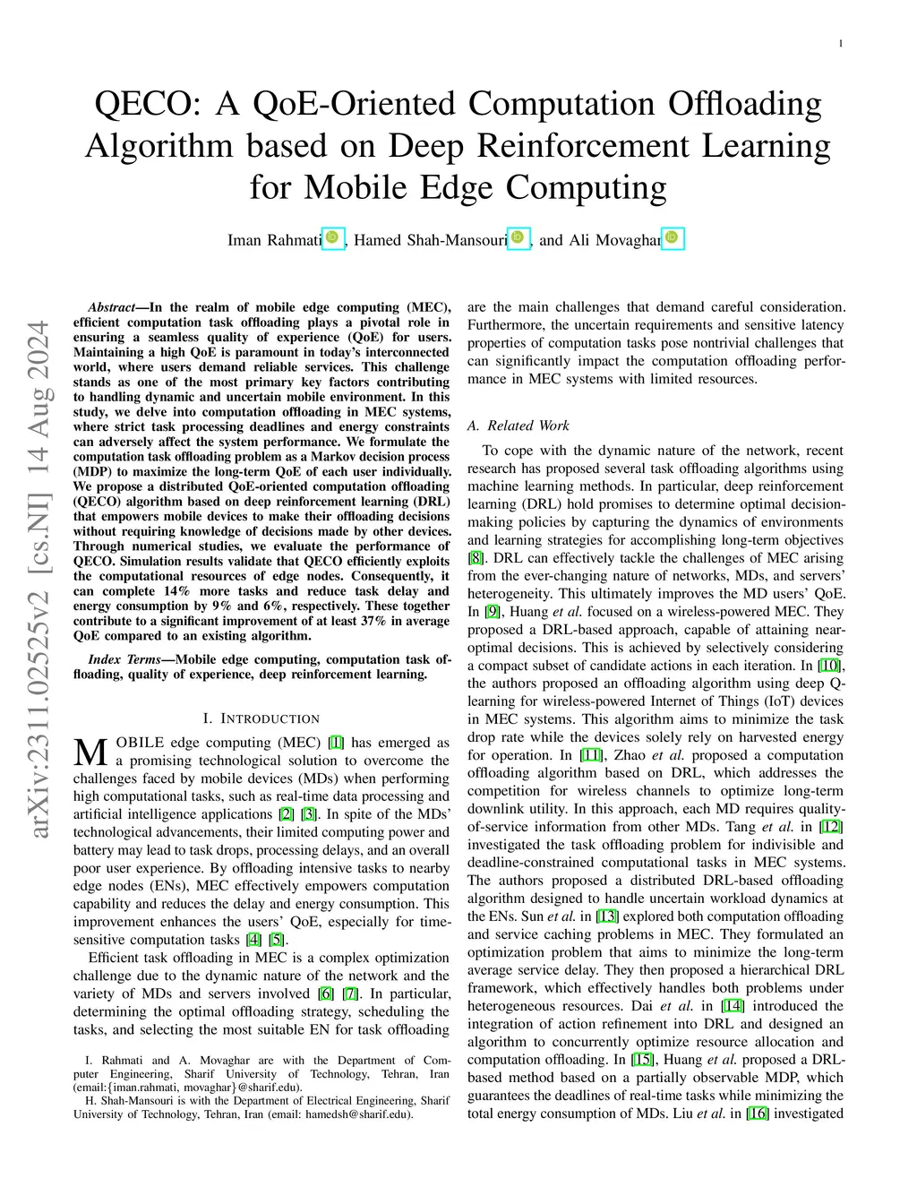QECO: A QoE-Oriented Computation Offloading Algorithm based on Deep Reinforcement Learning for Mobile Edge Computing