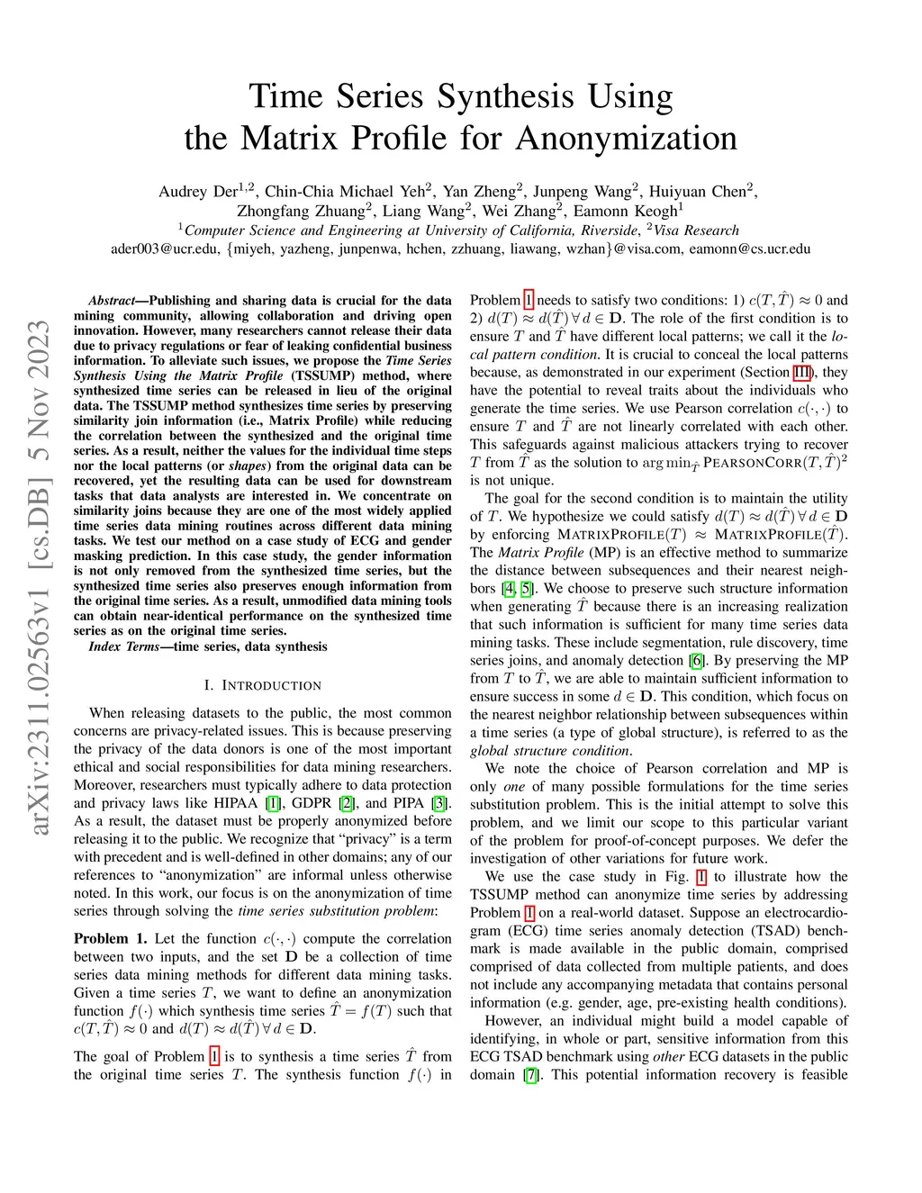 Publishing and sharing data is crucial for the data mining community, allowing collaboration and driving open innovation. However, many researchers cannot release their data due to privacy regulations or fear of leaking confidential business information. To alleviate such issues, we propose the Time Series Synthesis Using the Matrix Profile (TSSUMP) method, where synthesized time series can be released in lieu of the original data. The TSSUMP method synthesizes time series by preserving similarity join information (i.e., Matrix Profile) while reducing the correlation between the synthesized and the original time series. As a result, neither the values for the individual time steps nor the local patterns (or shapes) from the original data can be recovered, yet the resulting data can be used for downstream tasks that data analysts are interested in. We concentrate on similarity joins because they are one of the most widely applied time series data mining routines across different data mining tasks. We test our method on a case study of ECG and gender masking prediction. In this case study, the gender information is not only removed from the synthesized time series, but the synthesized time series also preserves enough information from the original time series. As a result, unmodified data mining tools can obtain near-identical performance on the synthesized time series as on the original time series.