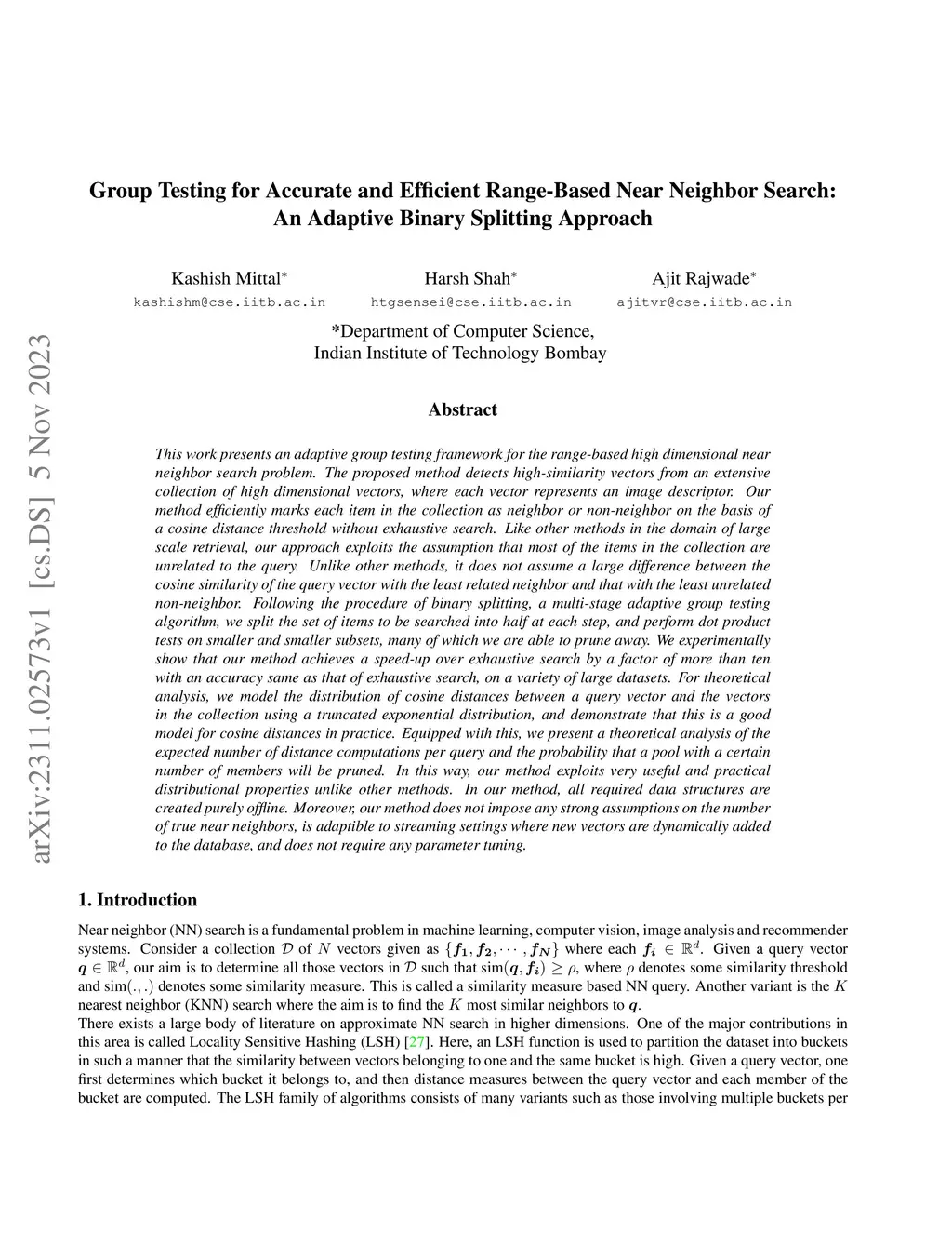 This work presents an adaptive group testing framework for the range-based high dimensional near neighbor search problem. The proposed method detects high-similarity vectors from an extensive collection of high dimensional vectors, where each vector represents an image descriptor. Our method efficiently marks each item in the collection as neighbor or non-neighbor on the basis of a cosine distance threshold without exhaustive search. Like other methods in the domain of large scale retrieval, our approach exploits the assumption that most of the items in the collection are unrelated to the query. Unlike other methods, it does not assume a large difference between the cosine similarity of the query vector with the least related neighbor and that with the least unrelated non-neighbor. Following the procedure of binary splitting, a multi-stage adaptive group testing algorithm, we split the set of items to be searched into half at each step, and perform dot product tests on smaller and smaller subsets, many of which we are able to prune away. We experimentally show that our method achieves a speed-up over exhaustive search by a factor of more than ten with an accuracy same as that of exhaustive search, on a variety of large datasets. We present a theoretical analysis of the expected number of distance computations per query and the probability that a pool with a certain number of members will be pruned. In this way, our method exploits very useful and practical distributional properties unlike other methods. In our method, all required data structures are created purely offline. Moreover, our method does not impose any strong assumptions on the number of true near neighbors, is adaptible to streaming settings where new vectors are dynamically added to the database, and does not require any parameter tuning.