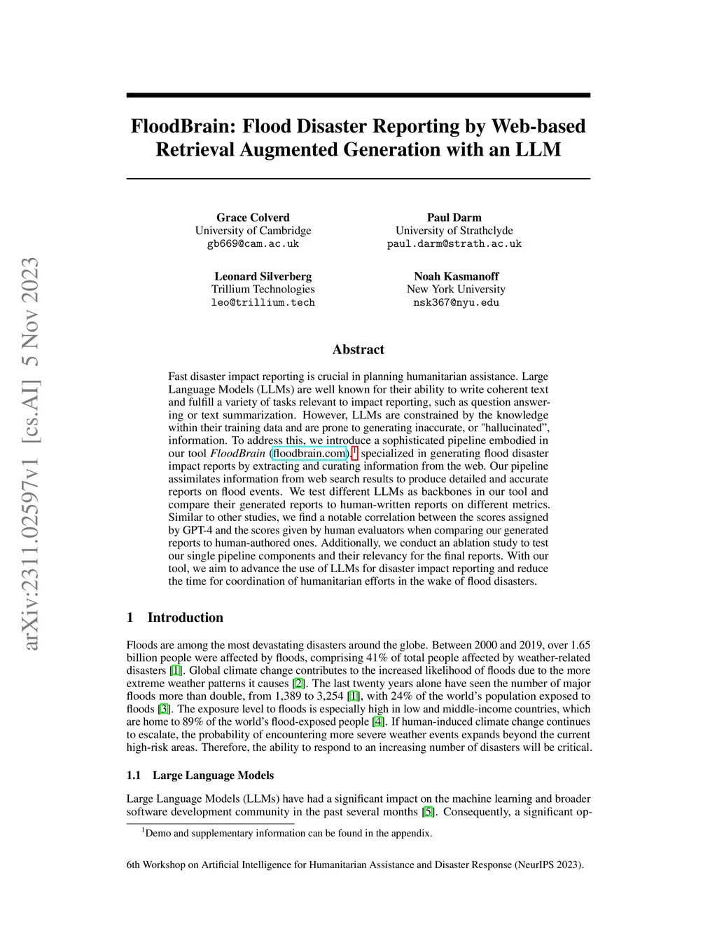 Fast disaster impact reporting is crucial in planning humanitarian assistance. Large Language Models (LLMs) are well known for their ability to write coherent text and fulfill a variety of tasks relevant to impact reporting, such as question answering or text summarization. However, LLMs are constrained by the knowledge within their training data and are prone to generating inaccurate, or "hallucinated", information. To address this, we introduce a sophisticated pipeline embodied in our tool FloodBrain (floodbrain.com), specialized in generating flood disaster impact reports by extracting and curating information from the web. Our pipeline assimilates information from web search results to produce detailed and accurate reports on flood events. We test different LLMs as backbones in our tool and compare their generated reports to human-written reports on different metrics. Similar to other studies, we find a notable correlation between the scores assigned by GPT-4 and the scores given by human evaluators when comparing our generated reports to human-authored ones. Additionally, we conduct an ablation study to test our single pipeline components and their relevancy for the final reports. With our tool, we aim to advance the use of LLMs for disaster impact reporting and reduce the time for coordination of humanitarian efforts in the wake of flood disasters.