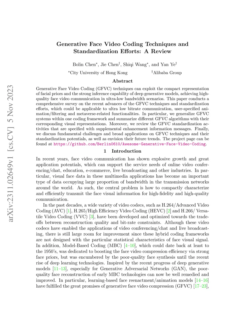 Generative Face Video Coding (GFVC) techniques can exploit the compact representation of facial priors and the strong inference capability of deep generative models, achieving high-quality face video communication in ultra-low bandwidth scenarios. This paper conducts a comprehensive survey on the recent advances of the GFVC techniques and standardization efforts, which could be applicable to ultra low bitrate communication, user-specified animation/filtering and metaverse-related functionalities. In particular, we generalize GFVC systems within one coding framework and summarize different GFVC algorithms with their corresponding visual representations. Moreover, we review the GFVC standardization activities that are specified with supplemental enhancement information messages. Finally, we discuss fundamental challenges and broad applications on GFVC techniques and their standardization potentials, as well as envision their future trends. The project page can be found at https://github.com/Berlin0610/Awesome-Generative-Face-Video-Coding.