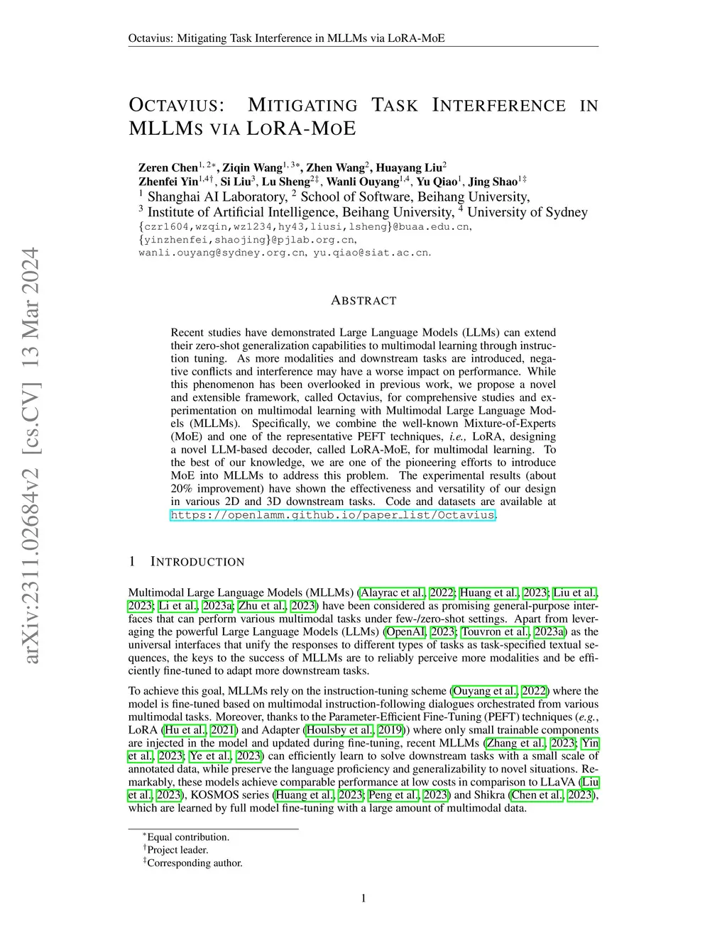 Recent studies have demonstrated Large Language Models (LLMs) can extend their zero-shot generalization capabilities to multimodal learning through instruction tuning. As more modalities and downstream tasks are introduced, negative conflicts and interference may have a worse impact on performance. While this phenomenon has been overlooked in previous work, we propose a novel and extensible framework, called Octavius, for comprehensive studies and experimentation on multimodal learning with Multimodal Large Language Models (MLLMs). Specifically, we combine the well-known Mixture-of-Experts (MoE) and one of the representative PEFT techniques, i.e., LoRA, designing a novel LLM-based decoder, called LoRA-MoE, for multimodal learning. To the best of our knowledge, we are one of the pioneering efforts to introduce MoE into MLLMs to address this problem. The experimental results (about 20% improvement) have shown the effectiveness and versatility of our design in various 2D and 3D downstream tasks. Code and datasets are available at https://openlamm.github.io/paper_list/Octavius.