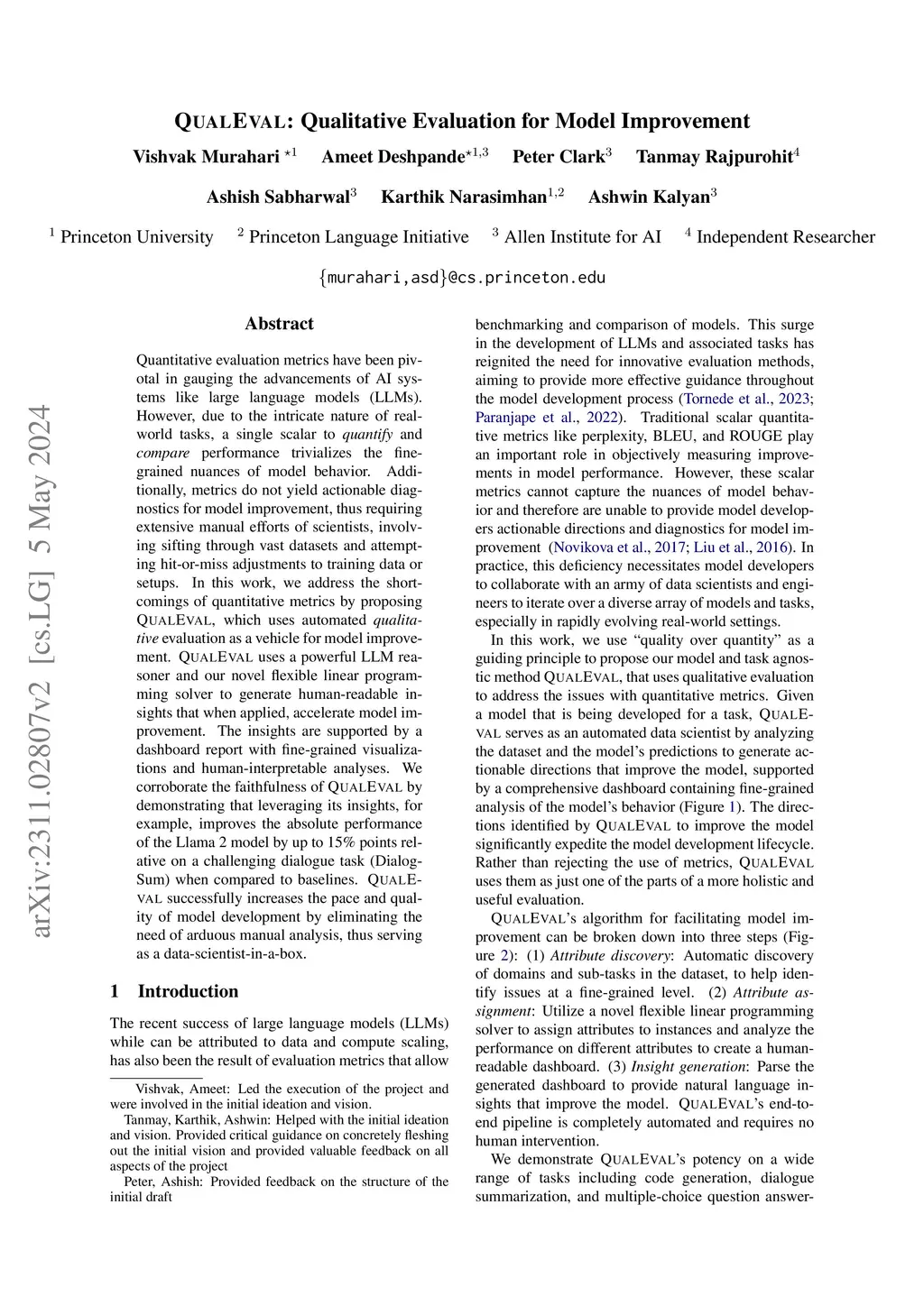 Quantitative evaluation metrics have traditionally been pivotal in gauging the advancements of artificial intelligence systems, including large language models (LLMs). However, these metrics have inherent limitations. Given the intricate nature of real-world tasks, a single scalar to quantify and compare is insufficient to capture the fine-grained nuances of model behavior. Metrics serve only as a way to compare and benchmark models, and do not yield actionable diagnostics, thus making the model improvement process challenging. Model developers find themselves amid extensive manual efforts involving sifting through vast datasets and attempting hit-or-miss adjustments to training data or setups. In this work, we address the shortcomings of quantitative metrics by proposing QualEval, which augments quantitative scalar metrics with automated qualitative evaluation as a vehicle for model improvement. QualEval uses a powerful LLM reasoner and our novel flexible linear programming solver to generate human-readable insights that when applied, accelerate model improvement. The insights are backed by a comprehensive dashboard with fine-grained visualizations and human-interpretable analyses. We corroborate the faithfulness of QualEval by demonstrating that leveraging its insights, for example, improves the absolute performance of the Llama 2 model by up to 15% points relative on a challenging dialogue task (DialogSum) when compared to baselines. QualEval successfully increases the pace of model development, thus in essence serving as a data-scientist-in-a-box. Given the focus on critiquing and improving current evaluation metrics, our method serves as a refreshingly new technique for both model evaluation and improvement.