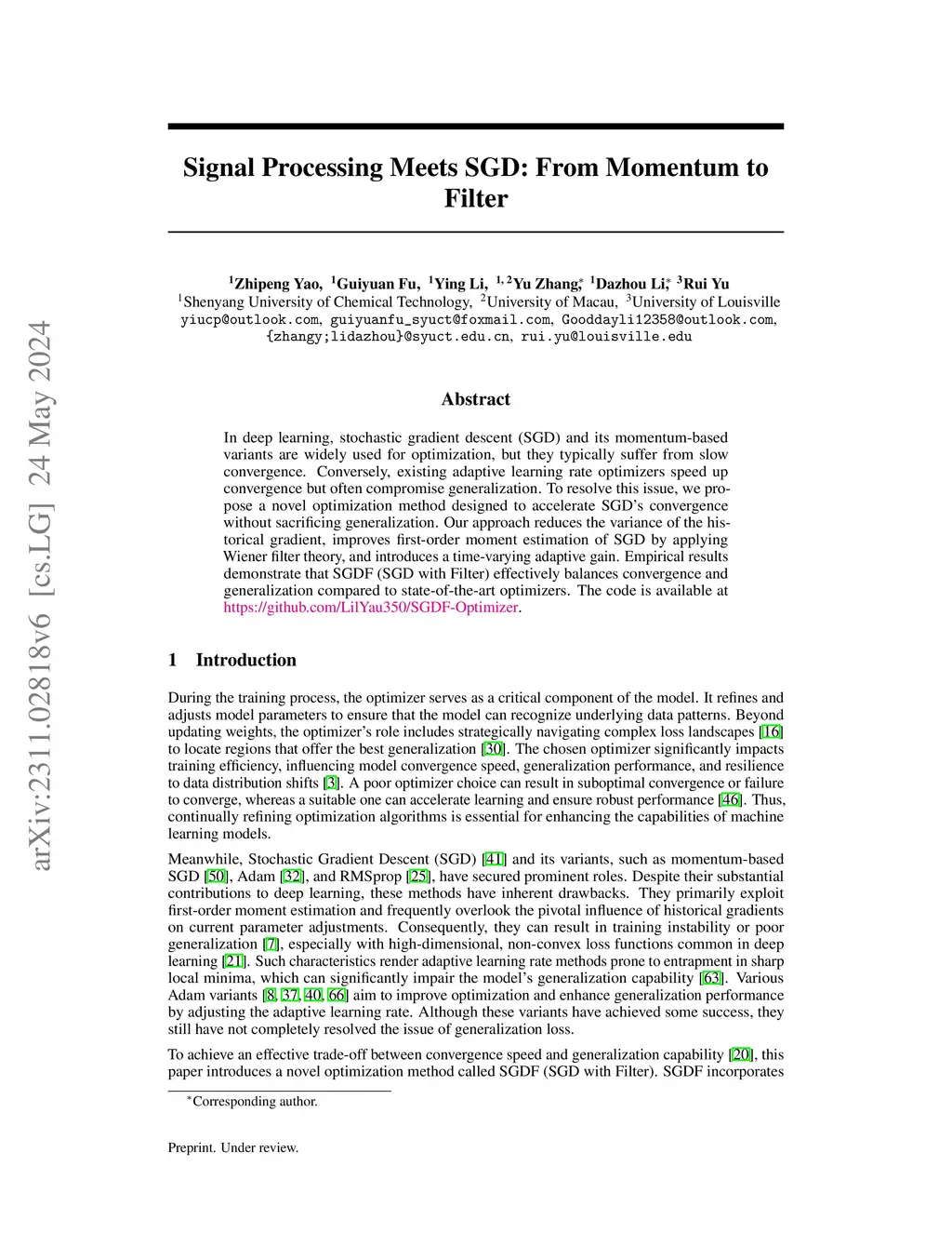 In deep learning, stochastic gradient descent (SGD) and its momentum-based variants are widely used for optimization, but they typically suffer from slow convergence. Conversely, existing adaptive learning rate optimizers speed up convergence but often compromise generalization. To resolve this issue, we propose a novel optimization method designed to accelerate SGD's convergence without sacrificing generalization. Our approach reduces the variance of the historical gradient, improves first-order moment estimation of SGD by applying Wiener filter theory, and introduces a time-varying adaptive gain. Empirical results demonstrate that SGDF (SGD with Filter) effectively balances convergence and generalization compared to state-of-the-art optimizers.