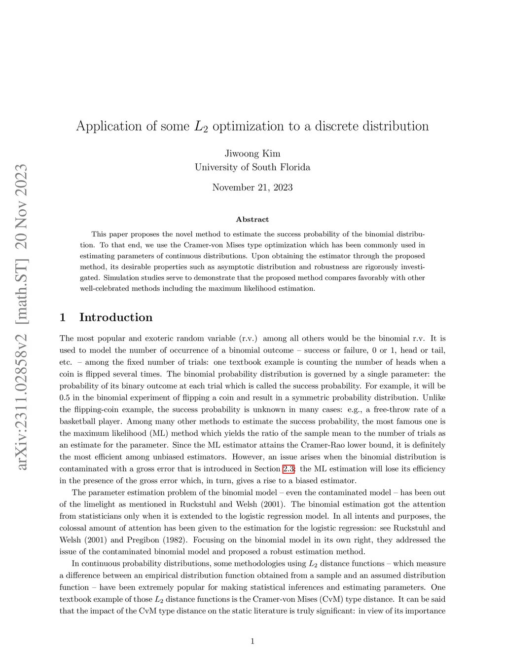 This paper proposes the novel estimator for the success probability parameter of a binomial distribution. To that end, we use the Cramer-von Mises type optimization methodology which has been popular for the parameter estimation in continuous distributions. Upon obtaining the estimator, desirable properties of the proposed estimation method such as asymptotic distribution and robustness are rigorously investigated. Simulation studies demonstrate that the proposed estimator compares favorably with other well-celebrated estimators.