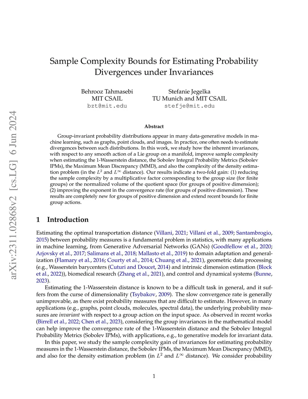 Group-invariant probability distributions appear in many data-generative models in machine learning, such as graphs, point clouds, and images. In practice, one often needs to estimate divergences between such distributions. In this work, we study how the inherent invariances, with respect to any smooth action of a Lie group on a manifold, improve sample complexity when estimating the 1-Wasserstein distance, the Sobolev Integral Probability Metrics (Sobolev IPMs), the Maximum Mean Discrepancy (MMD), and also the complexity of the density estimation problem (in the and distance). Our results indicate a two-fold gain: (1) reducing the sample complexity by a multiplicative factor corresponding to the group size (for finite groups) or the normalized volume of the quotient space (for groups of positive dimension); (2) improving the exponent in the convergence rate (for groups of positive dimension). These results are completely new for groups of positive dimension and extend recent bounds for finite group actions.