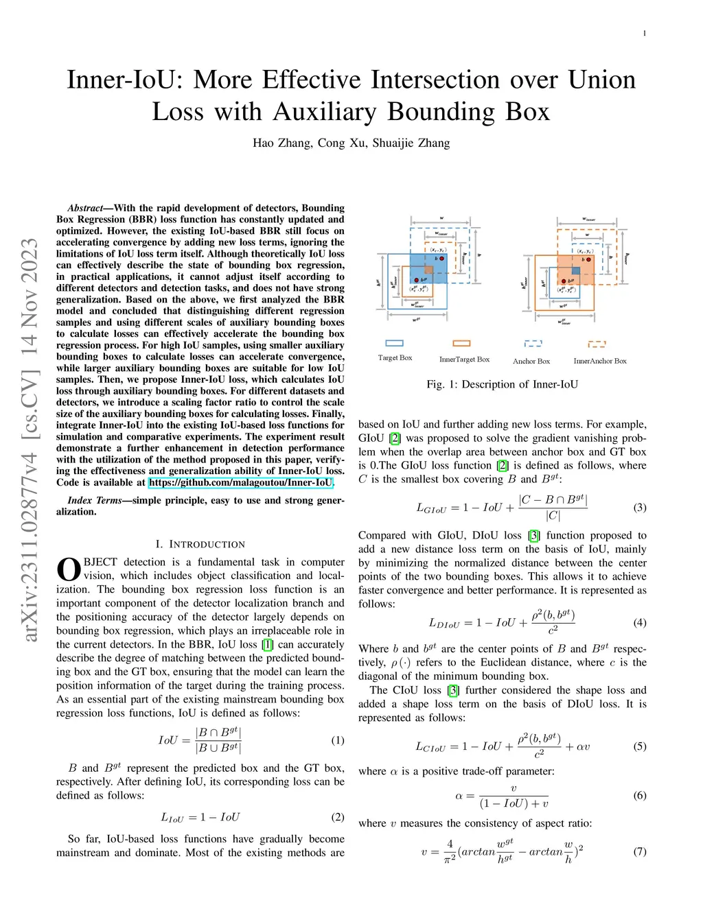 With the rapid development of detectors, Bounding Box Regression (BBR) loss function has constantly updated and optimized. However, the existing IoU-based BBR still focus on accelerating convergence by adding new loss terms, ignoring the limitations of IoU loss term itself. Although theoretically IoU loss can effectively describe the state of bounding box regression,in practical applications, it cannot adjust itself according to different detectors and detection tasks, and does not have strong generalization. Based on the above, we first analyzed the BBR model and concluded that distinguishing different regression samples and using different scales of auxiliary bounding boxes to calculate losses can effectively accelerate the bounding box regression process. For high IoU samples, using smaller auxiliary bounding boxes to calculate losses can accelerate convergence, while larger auxiliary bounding boxes are suitable for low IoU samples. Then, we propose Inner-IoU loss, which calculates IoU loss through auxiliary bounding boxes. For different datasets and detectors, we introduce a scaling factor ratio to control the scale size of the auxiliary bounding boxes for calculating losses. Finally, integrate Inner-IoU into the existing IoU-based loss functions for simulation and comparative experiments. The experiment result demonstrate a further enhancement in detection performance with the utilization of the method proposed in this paper, verifying the effectiveness and generalization ability of Inner-IoU loss. Code is available at https://github.com/malagoutou/Inner-IoU.