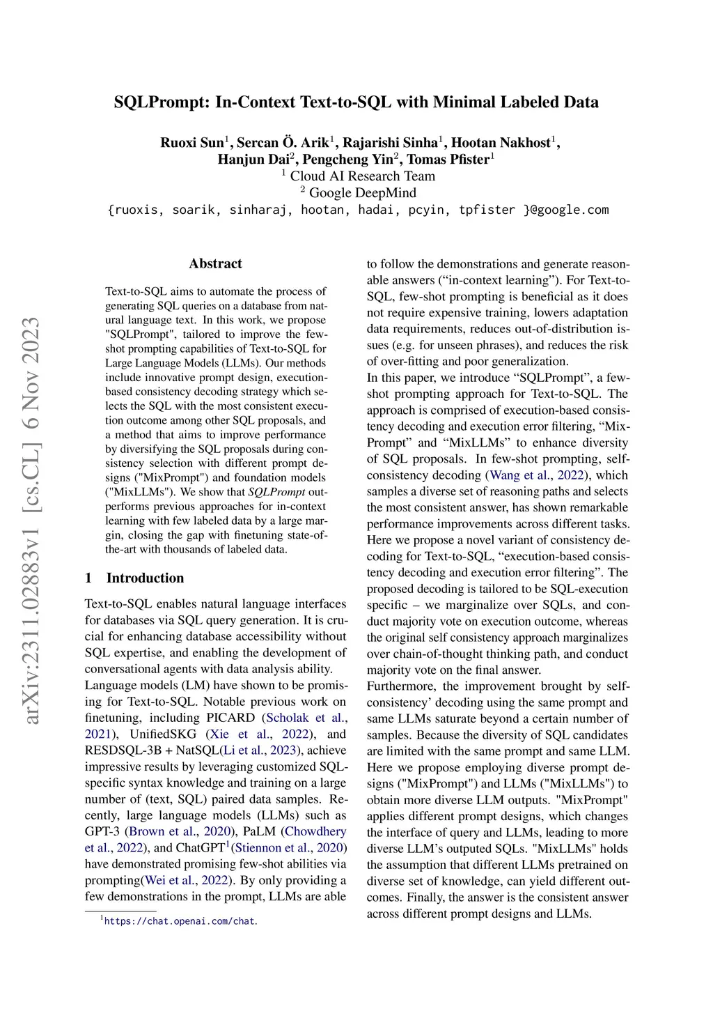 Text-to-SQL aims to automate the process of generating SQL queries on a database from natural language text. In this work, we propose "SQLPrompt", tailored to improve the few-shot prompting capabilities of Text-to-SQL for Large Language Models (LLMs). Our methods include innovative prompt design, execution-based consistency decoding strategy which selects the SQL with the most consistent execution outcome among other SQL proposals, and a method that aims to improve performance by diversifying the SQL proposals during consistency selection with different prompt designs ("MixPrompt") and foundation models ("MixLLMs"). We show that \emph{SQLPrompt} outperforms previous approaches for in-context learning with few labeled data by a large margin, closing the gap with finetuning state-of-the-art with thousands of labeled data.