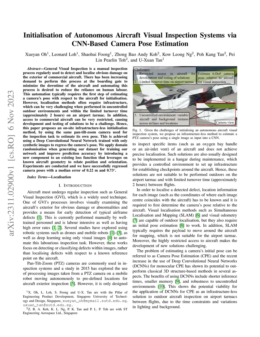 General Visual Inspection is a manual inspection process regularly used to detect and localise obvious damage on the exterior of commercial aircraft. There has been increasing demand to perform this process at the boarding gate to minimize the downtime of the aircraft and automating this process is desired to reduce the reliance on human labour. This automation typically requires the first step of estimating a camera's pose with respect to the aircraft for initialisation. However, localisation methods often require infrastructure, which can be very challenging when performed in uncontrolled outdoor environments and within the limited turnover time (approximately 2 hours) on an airport tarmac. In addition, access to commercial aircraft can be very restricted, causing development and testing of solutions to be a challenge. Hence, this paper proposes an on-site infrastructure-less initialisation method, by using the same pan-tilt-zoom camera used for the inspection task to estimate its own pose. This is achieved using a Deep Convolutional Neural Network trained with only synthetic images to regress the camera's pose. We apply domain randomisation when generating our dataset for training our network and improve prediction accuracy by introducing a new component to an existing loss function that leverages on known aircraft geometry to relate position and orientation. Experiments are conducted and we have successfully regressed camera poses with a median error of 0.22 m and 0.73 degrees.