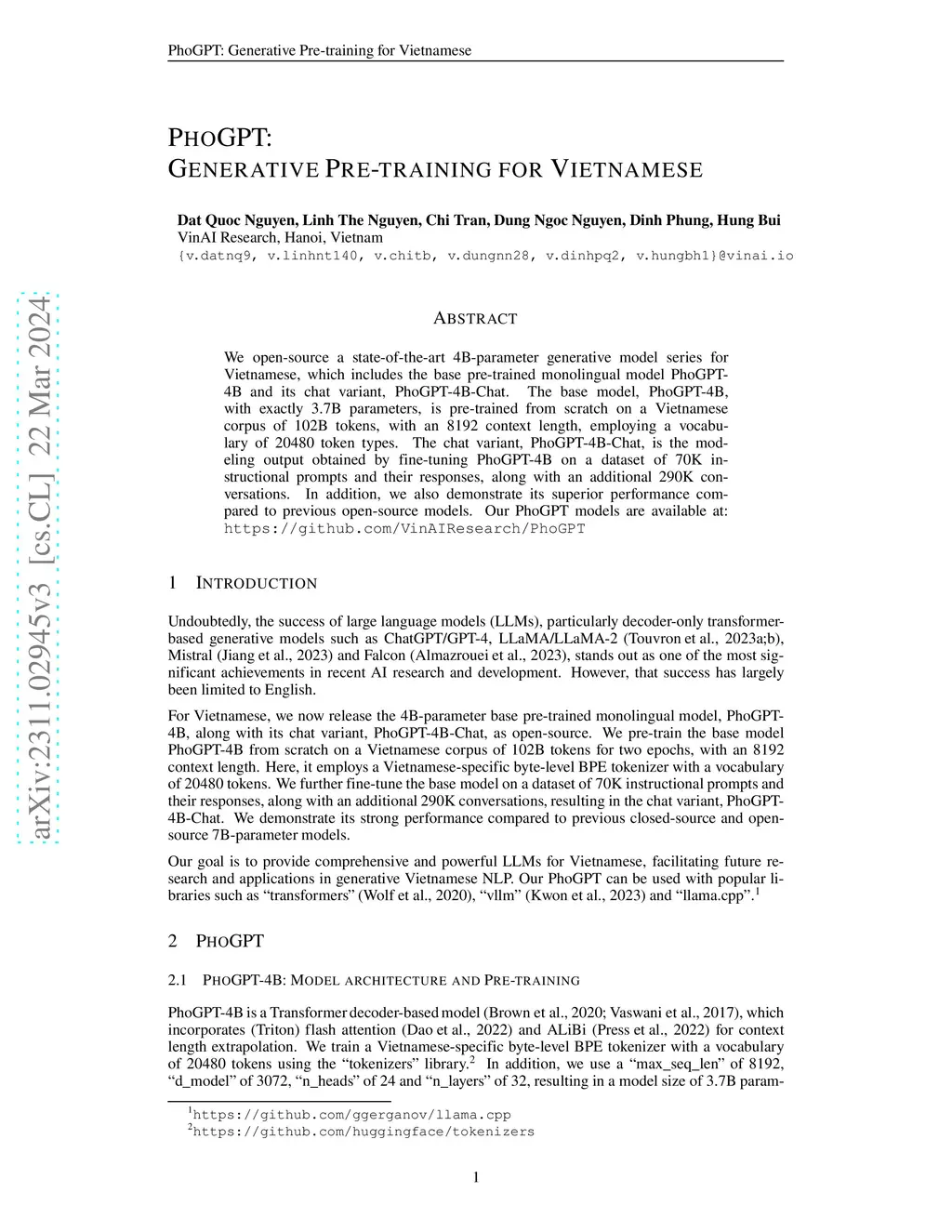 PhoGPT: Generative Pre-training for Vietnamese