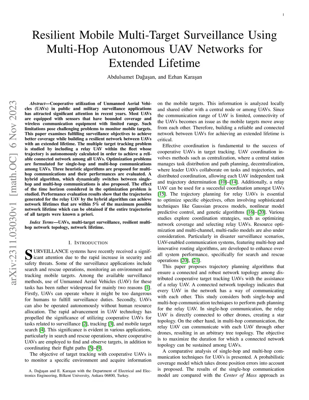 Cooperative utilization of Unmanned Aerial Vehicles (UAVs) in public and military surveillance applications has attracted significant attention in recent years. Most UAVs are equipped with sensors that have bounded coverage and wireless communication equipment with limited range. Such limitations pose challenging problems to monitor mobile targets. This paper examines fulfilling surveillance objectives to achieve better coverage while building a resilient network between UAVs with an extended lifetime. The multiple target tracking problem is studied by including a relay UAV within the fleet whose trajectory is autonomously calculated in order to achieve a reliable connected network among all UAVs. Optimization problems are formulated for single-hop and multi-hop communications among UAVs. Three heuristic algorithms are proposed for multi-hop communications and their performances are evaluated. A hybrid algorithm, which dynamically switches between single-hop and multi-hop communications is also proposed. The effect of the time horizon considered in the optimization problem is studied. Performance evaluation results show that the trajectories generated for the relay UAV by the hybrid algorithm can achieve network lifetimes that are within 5% of the maximum possible network lifetime which can be obtained if the entire trajectories of all targets were known a priori.