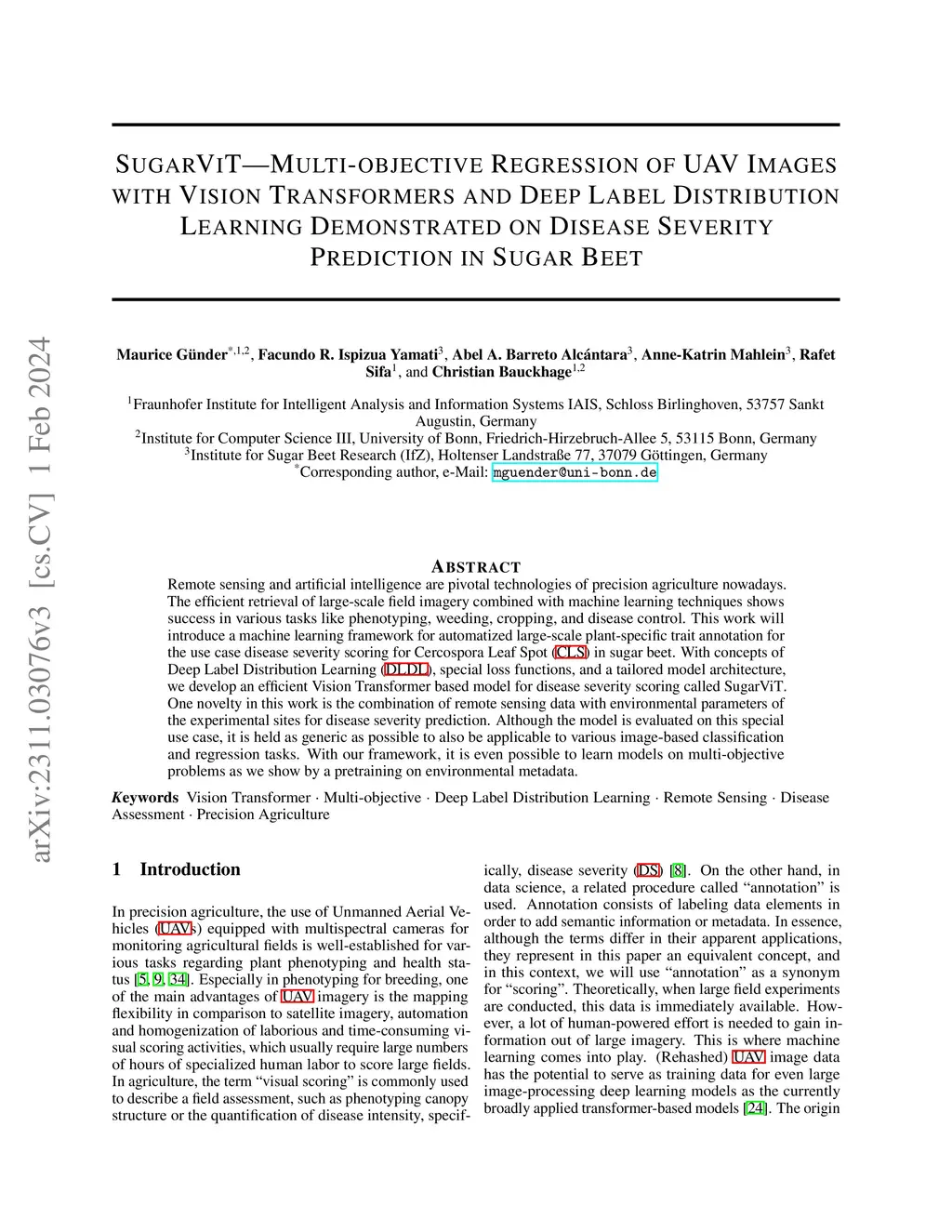 Remote sensing and artificial intelligence are pivotal technologies of precision agriculture nowadays. The efficient retrieval of large-scale field imagery combined with machine learning techniques shows success in various tasks like phenotyping, weeding, cropping, and disease control. This work will introduce a machine learning framework for automatized large-scale plant-specific trait annotation for the use case disease severity scoring for Cercospora Leaf Spot (CLS) in sugar beet. With concepts of Deep Label Distribution Learning (DLDL), special loss functions, and a tailored model architecture, we develop an efficient Vision Transformer based model for disease severity scoring called SugarViT. One novelty in this work is the combination of remote sensing data with environmental parameters of the experimental sites for disease severity prediction. Although the model is evaluated on this special use case, it is held as generic as possible to also be applicable to various image-based classification and regression tasks. With our framework, it is even possible to learn models on multi-objective problems as we show by a pretraining on environmental metadata.