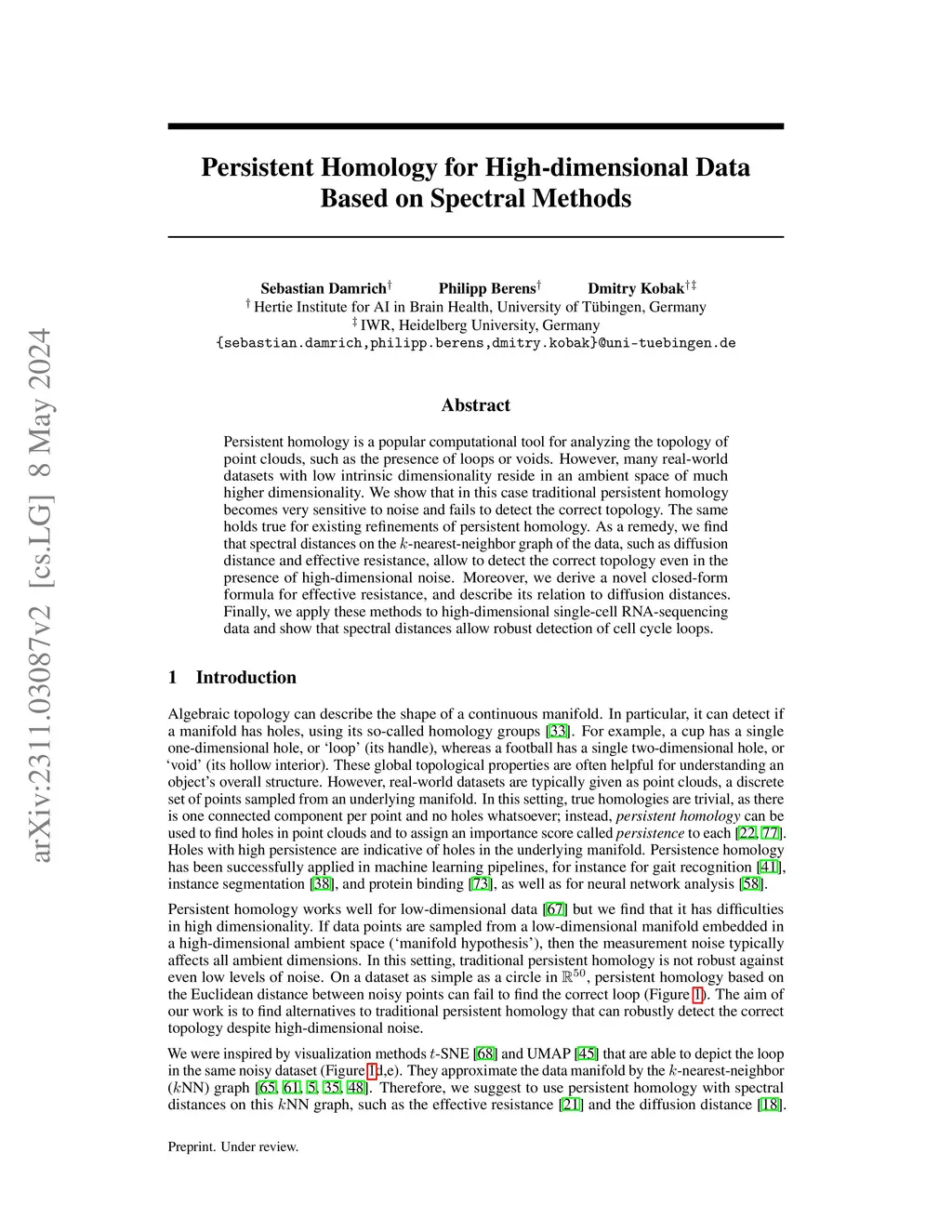 Persistent homology is a popular computational tool for analyzing the topology of point clouds, such as the presence of loops or voids. However, many real-world datasets with low intrinsic dimensionality reside in an ambient space of much higher dimensionality. We show that in this case traditional persistent homology becomes very sensitive to noise and fails to detect the correct topology. The same holds true for existing refinements of persistent homology. As a remedy, we find that spectral distances on the -nearest-neighbor graph of the data, such as diffusion distance and effective resistance, allow to detect the correct topology even in the presence of high-dimensional noise. Moreover, we derive a novel closed-form formula for effective resistance, and describe its relation to diffusion distances. Finally, we apply these methods to high-dimensional single-cell RNA-sequencing data and show that spectral distances allow robust detection of cell cycle loops.