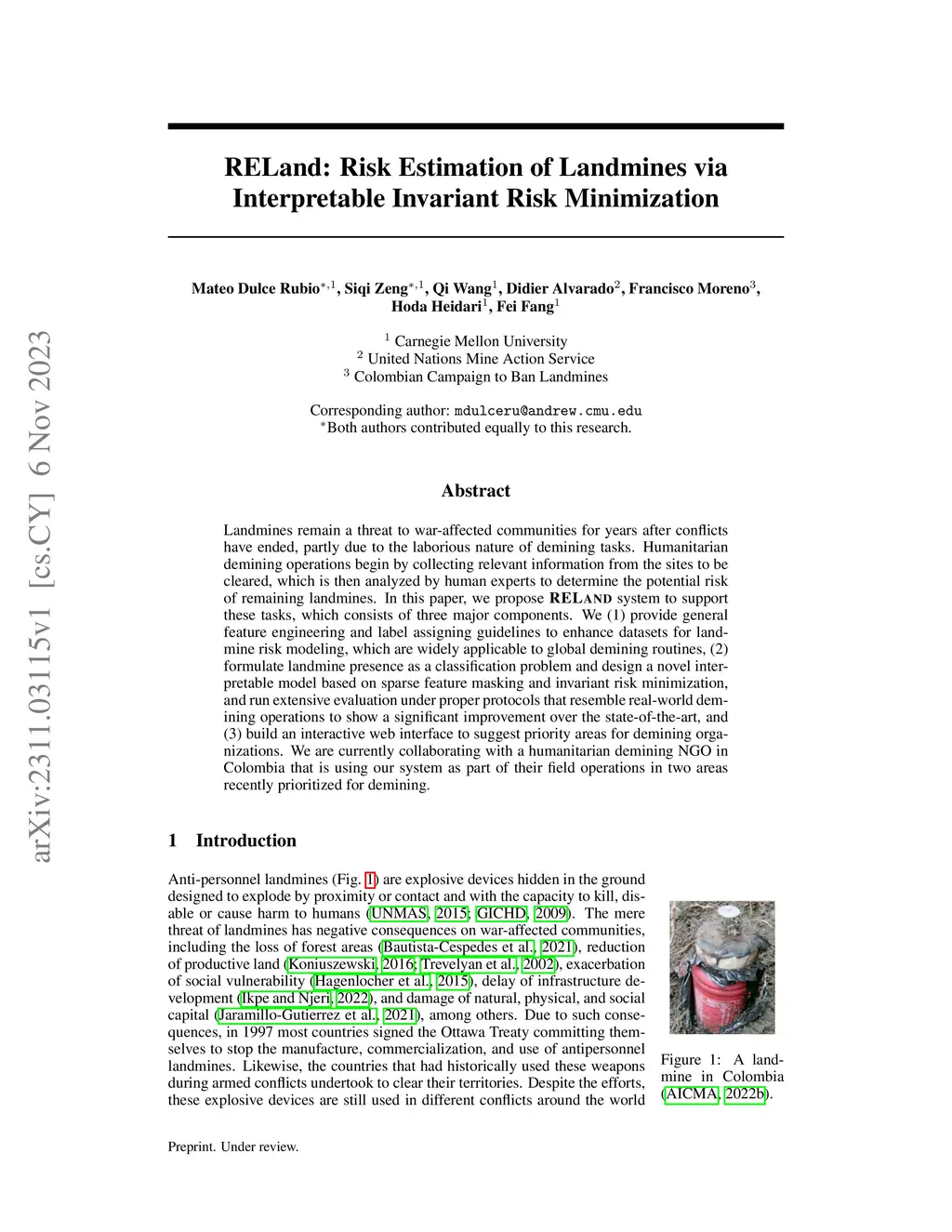 Landmines remain a threat to war-affected communities for years after conflicts have ended, partly due to the laborious nature of demining tasks. Humanitarian demining operations begin by collecting relevant information from the sites to be cleared, which is then analyzed by human experts to determine the potential risk of remaining landmines. In this paper, we propose RELand system to support these tasks, which consists of three major components. We (1) provide general feature engineering and label assigning guidelines to enhance datasets for landmine risk modeling, which are widely applicable to global demining routines, (2) formulate landmine presence as a classification problem and design a novel interpretable model based on sparse feature masking and invariant risk minimization, and run extensive evaluation under proper protocols that resemble real-world demining operations to show a significant improvement over the state-of-the-art, and (3) build an interactive web interface to suggest priority areas for demining organizations. We are currently collaborating with a humanitarian demining NGO in Colombia that is using our system as part of their field operations in two areas recently prioritized for demining.