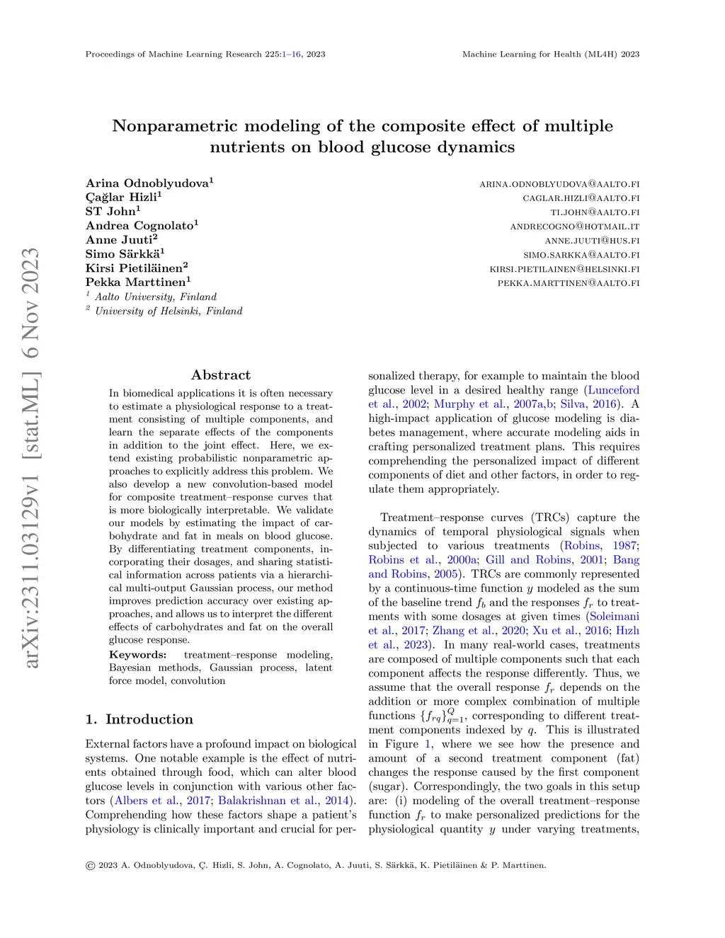 In biomedical applications it is often necessary to estimate a physiological response to a treatment consisting of multiple components, and learn the separate effects of the components in addition to the joint effect. Here, we extend existing probabilistic nonparametric approaches to explicitly address this problem. We also develop a new convolution-based model for composite treatment-response curves that is more biologically interpretable. We validate our models by estimating the impact of carbohydrate and fat in meals on blood glucose. By differentiating treatment components, incorporating their dosages, and sharing statistical information across patients via a hierarchical multi-output Gaussian process, our method improves prediction accuracy over existing approaches, and allows us to interpret the different effects of carbohydrates and fat on the overall glucose response.