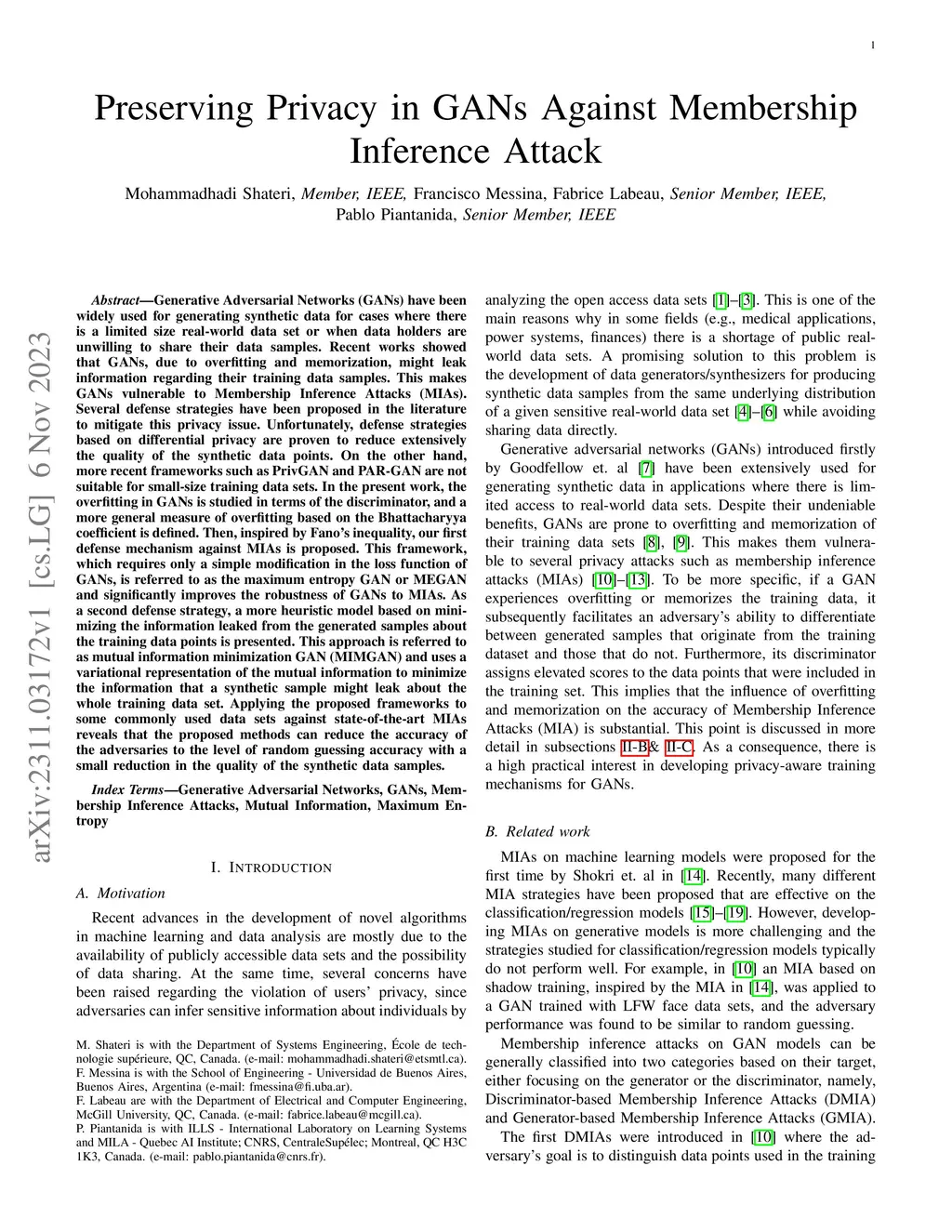 Generative Adversarial Networks (GANs) have been widely used for generating synthetic data for cases where there is a limited size real-world dataset or when data holders are unwilling to share their data samples. Recent works showed that GANs, due to overfitting and memorization, might leak information regarding their training data samples. This makes GANs vulnerable to Membership Inference Attacks (MIAs). Several defense strategies have been proposed in the literature to mitigate this privacy issue. Unfortunately, defense strategies based on differential privacy are proven to reduce extensively the quality of the synthetic data points. On the other hand, more recent frameworks such as PrivGAN and PAR-GAN are not suitable for small-size training datasets. In the present work, the overfitting in GANs is studied in terms of the discriminator, and a more general measure of overfitting based on the Bhattacharyya coefficient is defined. Then, inspired by Fano's inequality, our first defense mechanism against MIAs is proposed. This framework, which requires only a simple modification in the loss function of GANs, is referred to as the maximum entropy GAN or MEGAN and significantly improves the robustness of GANs to MIAs. As a second defense strategy, a more heuristic model based on minimizing the information leaked from generated samples about the training data points is presented. This approach is referred to as mutual information minimization GAN (MIMGAN) and uses a variational representation of the mutual information to minimize the information that a synthetic sample might leak about the whole training data set. Applying the proposed frameworks to some commonly used data sets against state-of-the-art MIAs reveals that the proposed methods can reduce the accuracy of the adversaries to the level of random guessing accuracy with a small reduction in the quality of the synthetic data samples.