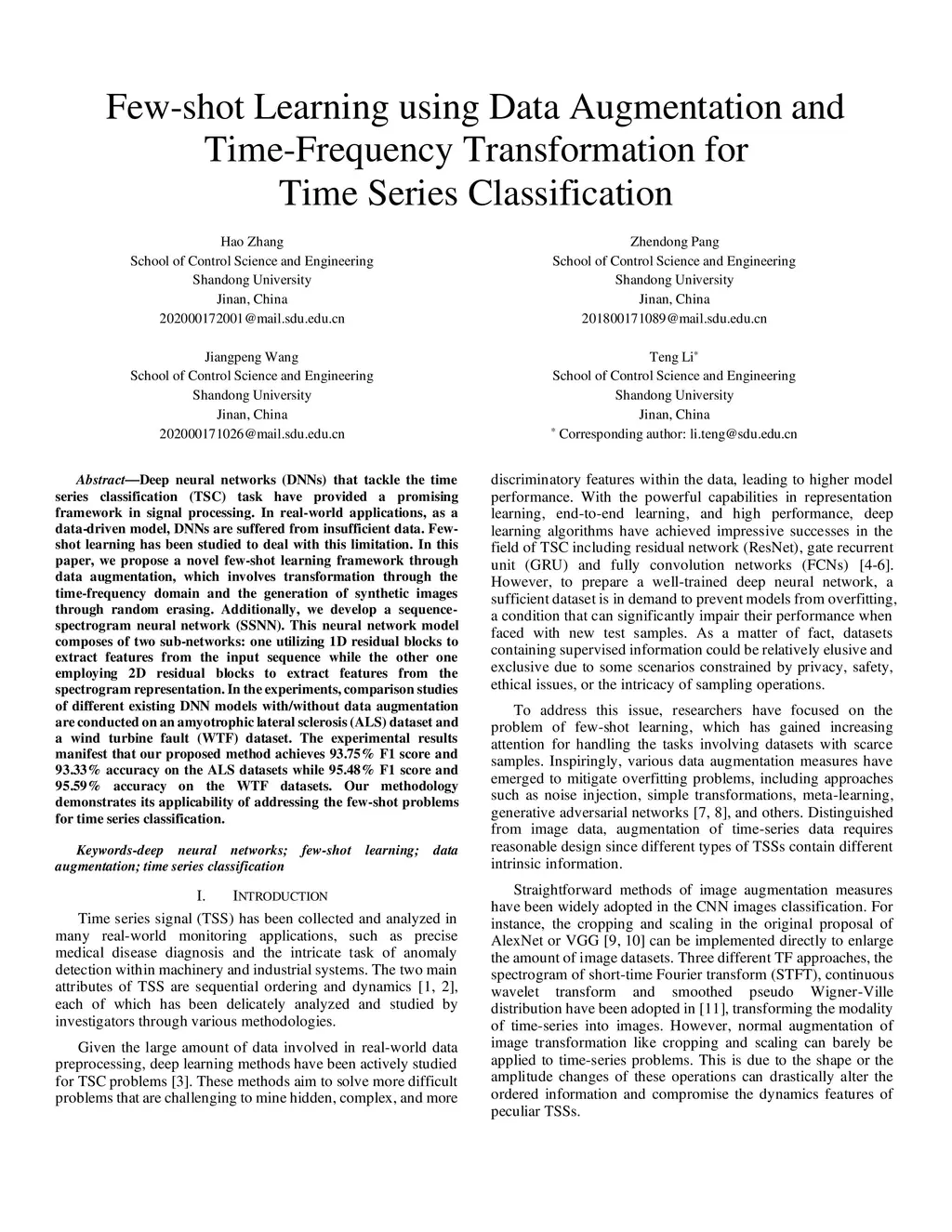 Deep neural networks (DNNs) that tackle the time series classification (TSC) task have provided a promising framework in signal processing. In real-world applications, as a data-driven model, DNNs are suffered from insufficient data. Few-shot learning has been studied to deal with this limitation. In this paper, we propose a novel few-shot learning framework through data augmentation, which involves transformation through the time-frequency domain and the generation of synthetic images through random erasing. Additionally, we develop a sequence-spectrogram neural network (SSNN). This neural network model composes of two sub-networks: one utilizing 1D residual blocks to extract features from the input sequence while the other one employing 2D residual blocks to extract features from the spectrogram representation. In the experiments, comparison studies of different existing DNN models with/without data augmentation are conducted on an amyotrophic lateral sclerosis (ALS) dataset and a wind turbine fault (WTF) dataset. The experimental results manifest that our proposed method achieves 93.75% F1 score and 93.33% accuracy on the ALS datasets while 95.48% F1 score and 95.59% accuracy on the WTF datasets. Our methodology demonstrates its applicability of addressing the few-shot problems for time series classification.