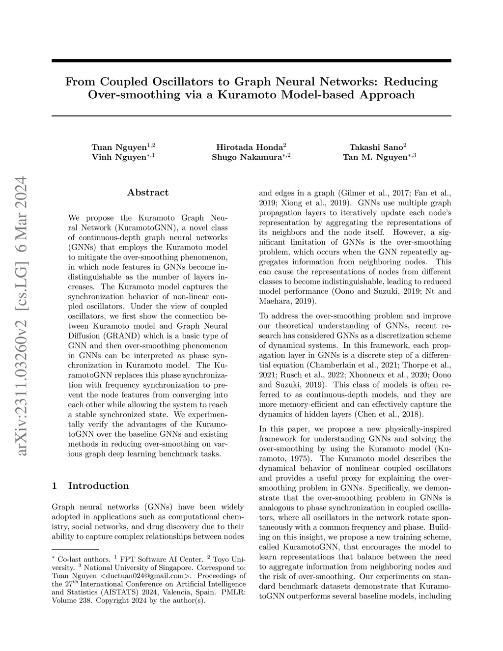 We propose the Kuramoto Graph Neural Network (KuramotoGNN), a novel class of continuous-depth graph neural networks (GNNs) that employs the Kuramoto model to mitigate the over-smoothing phenomenon, in which node features in GNNs become indistinguishable as the number of layers increases. The Kuramoto model captures the synchronization behavior of non-linear coupled oscillators. Under the view of coupled oscillators, we first show the connection between Kuramoto model and basic GNN and then over-smoothing phenomenon in GNNs can be interpreted as phase synchronization in Kuramoto model. The KuramotoGNN replaces this phase synchronization with frequency synchronization to prevent the node features from converging into each other while allowing the system to reach a stable synchronized state. We experimentally verify the advantages of the KuramotoGNN over the baseline GNNs and existing methods in reducing over-smoothing on various graph deep learning benchmark tasks.