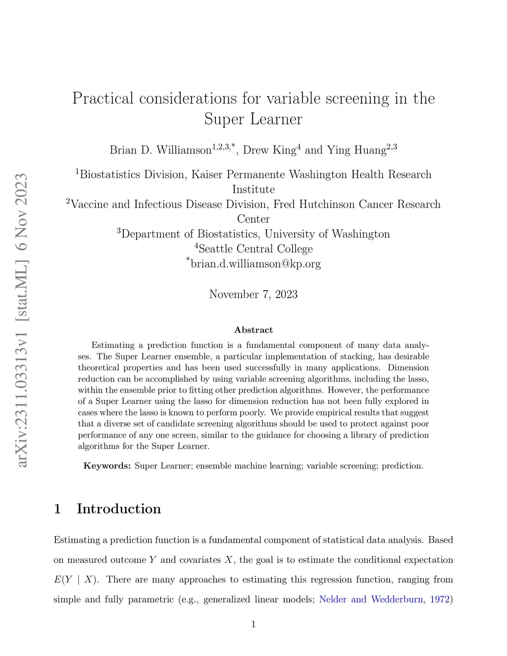 Estimating a prediction function is a fundamental component of many data analyses. The super learner ensemble, a particular implementation of stacking, has desirable theoretical properties and has been used successfully in many applications. Dimension reduction can be accomplished by using variable screening algorithms (screeners), including the lasso, within the ensemble prior to fitting other prediction algorithms. However, the performance of a super learner using the lasso for dimension reduction has not been fully explored in cases where the lasso is known to perform poorly. We provide empirical results that suggest that a diverse set of candidate screeners should be used to protect against poor performance of any one screener, similar to the guidance for choosing a library of prediction algorithms for the super learner. These results are further illustrated through the analysis of HIV-1 antibody data.