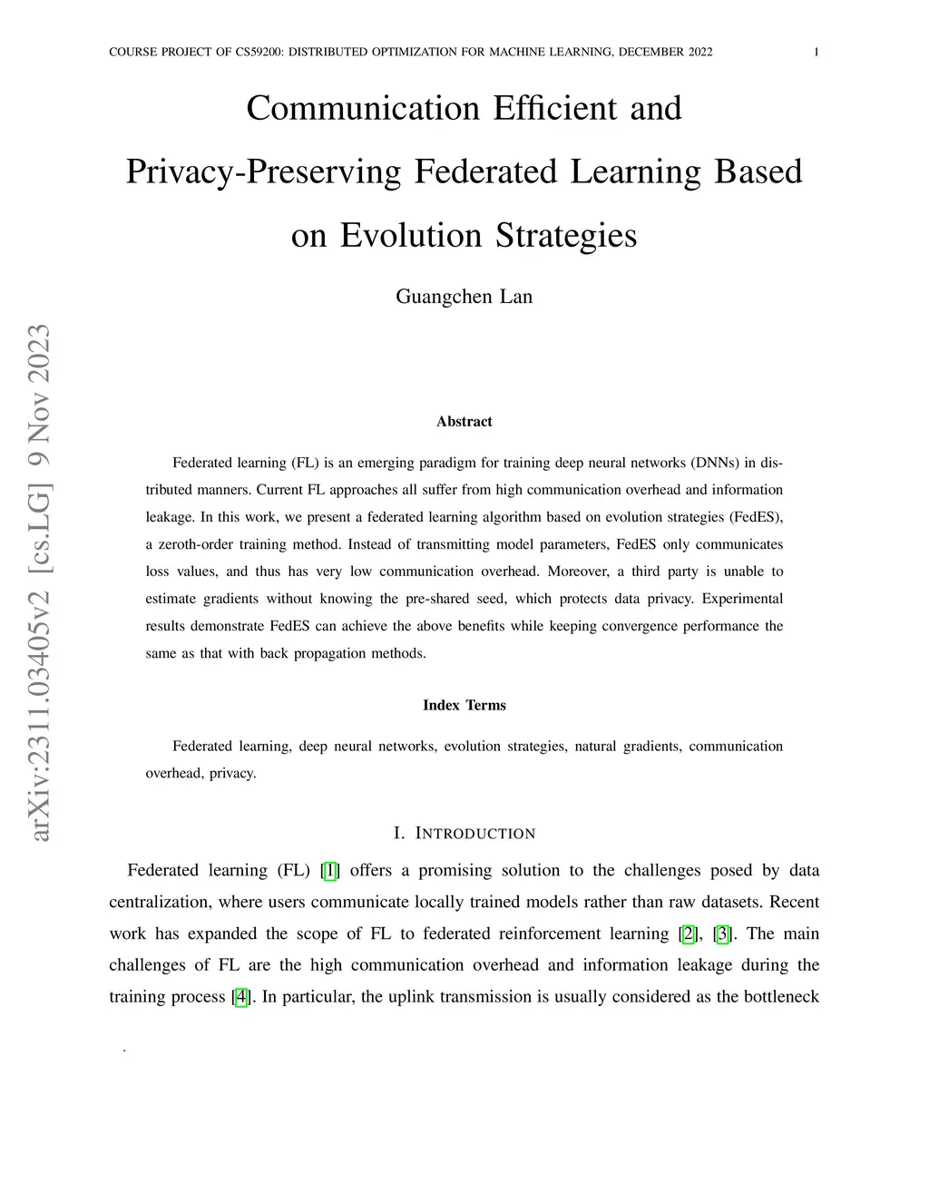 Federated learning (FL) is an emerging paradigm for training deep neural networks (DNNs) in distributed manners. Current FL approaches all suffer from high communication overhead and information leakage. In this work, we present a federated learning algorithm based on evolution strategies (FedES), a zeroth-order training method. Instead of transmitting model parameters, FedES only communicates loss values, and thus has very low communication overhead. Moreover, a third party is unable to estimate gradients without knowing the pre-shared seed, which protects data privacy. Experimental results demonstrate FedES can achieve the above benefits while keeping convergence performance the same as that with back propagation methods.