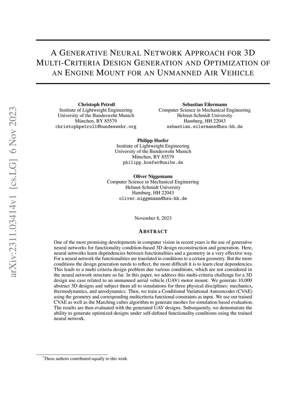 One of the most promising developments in computer vision in recent years is the use of generative neural networks for functionality condition-based 3D design reconstruction and generation. Here, neural networks learn dependencies between functionalities and a geometry in a very effective way. For a neural network the functionalities are translated in conditions to a certain geometry. But the more conditions the design generation needs to reflect, the more difficult it is to learn clear dependencies. This leads to a multi criteria design problem due various conditions, which are not considered in the neural network structure so far. In this paper, we address this multi-criteria challenge for a 3D design use case related to an unmanned aerial vehicle (UAV) motor mount. We generate 10,000 abstract 3D designs and subject them all to simulations for three physical disciplines: mechanics, thermodynamics, and aerodynamics. Then, we train a Conditional Variational Autoencoder (CVAE) using the geometry and corresponding multicriteria functional constraints as input. We use our trained CVAE as well as the Marching cubes algorithm to generate meshes for simulation based evaluation. The results are then evaluated with the generated UAV designs. Subsequently, we demonstrate the ability to generate optimized designs under self-defined functionality conditions using the trained neural network.