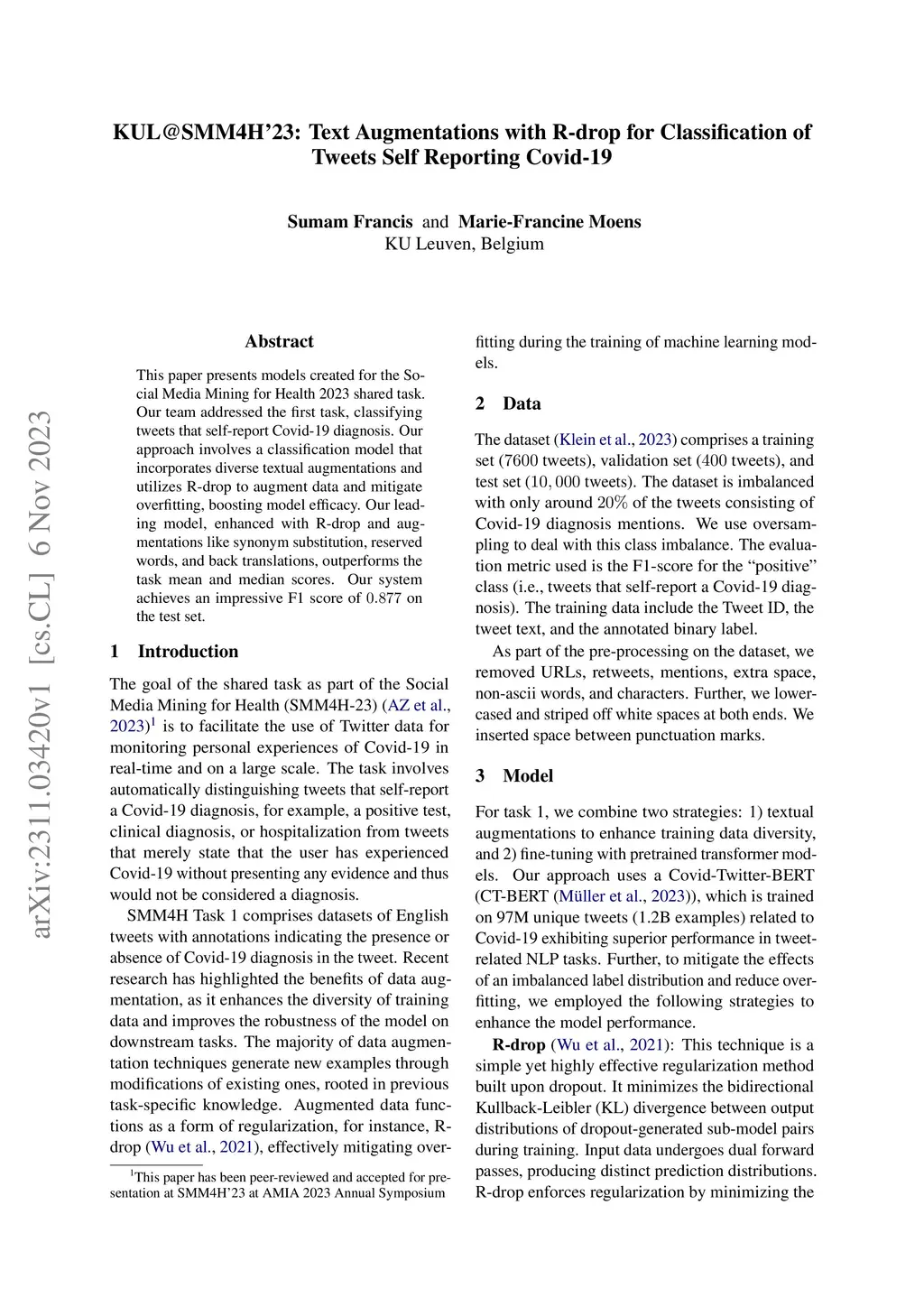 This paper presents models created for the Social Media Mining for Health 2023 shared task. Our team addressed the first task, classifying tweets that self-report Covid-19 diagnosis. Our approach involves a classification model that incorporates diverse textual augmentations and utilizes R-drop to augment data and mitigate overfitting, boosting model efficacy. Our leading model, enhanced with R-drop and augmentations like synonym substitution, reserved words, and back translations, outperforms the task mean and median scores. Our system achieves an impressive F1 score of 0.877 on the test set.