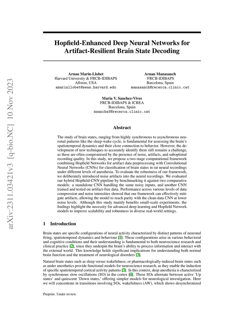 The study of brain states, ranging from highly synchronous to asynchronous neuronal patterns like the sleep-wake cycle, is fundamental for assessing the brain's spatiotemporal dynamics and their close connection to behavior. However, the development of new techniques to accurately identify them still remains a challenge, as these are often compromised by the presence of noise, artifacts, and suboptimal recording quality. In this study, we propose a two-stage computational framework combining Hopfield Networks for artifact data preprocessing with Convolutional Neural Networks (CNNs) for classification of brain states in rat neural recordings under different levels of anesthesia. To evaluate the robustness of our framework, we deliberately introduced noise artifacts into the neural recordings. We evaluated our hybrid Hopfield-CNN pipeline by benchmarking it against two comparative models: a standalone CNN handling the same noisy inputs, and another CNN trained and tested on artifact-free data. Performance across various levels of data compression and noise intensities showed that our framework can effectively mitigate artifacts, allowing the model to reach parity with the clean-data CNN at lower noise levels. Although this study mainly benefits small-scale experiments, the findings highlight the necessity for advanced deep learning and Hopfield Network models to improve scalability and robustness in diverse real-world settings.