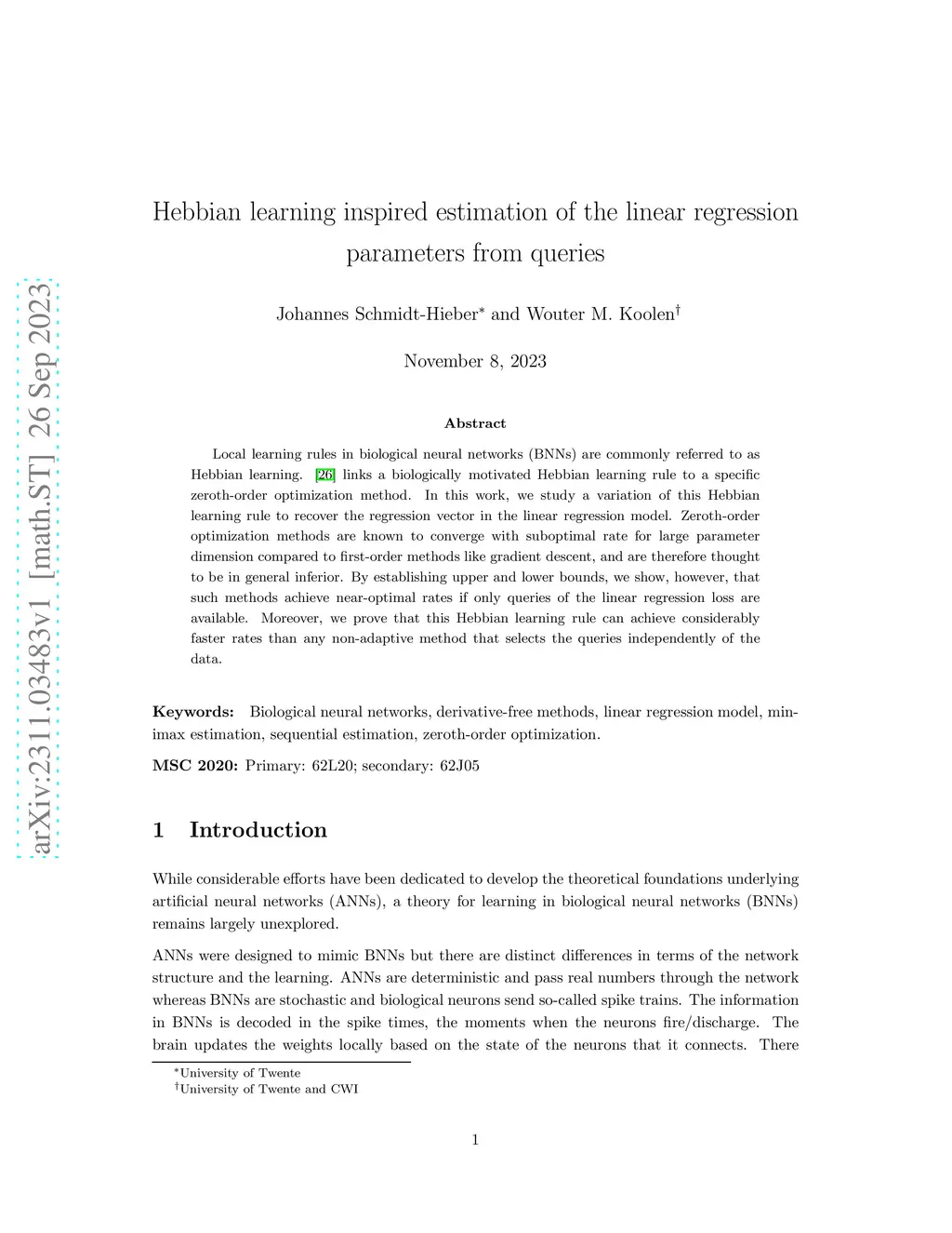 Local learning rules in biological neural networks (BNNs) are commonly referred to as Hebbian learning. [26] links a biologically motivated Hebbian learning rule to a specific zeroth-order optimization method. In this work, we study a variation of this Hebbian learning rule to recover the regression vector in the linear regression model. Zeroth-order optimization methods are known to converge with suboptimal rate for large parameter dimension compared to first-order methods like gradient descent, and are therefore thought to be in general inferior. By establishing upper and lower bounds, we show, however, that such methods achieve near-optimal rates if only queries of the linear regression loss are available. Moreover, we prove that this Hebbian learning rule can achieve considerably faster rates than any non-adaptive method that selects the queries independently of the data.