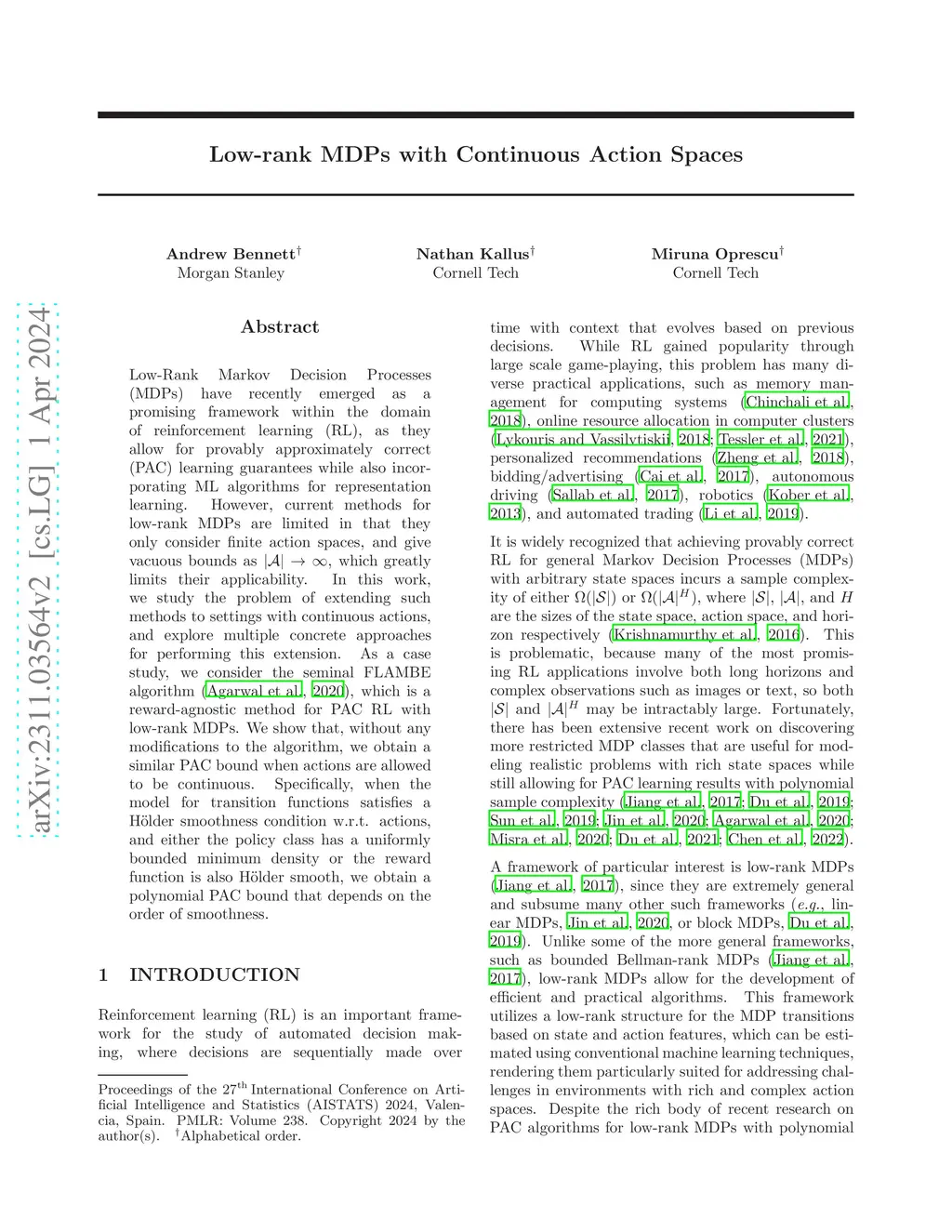 Low-Rank Markov Decision Processes (MDPs) have recently emerged as a promising framework within the domain of reinforcement learning (RL), as they allow for provably approximately correct (PAC) learning guarantees while also incorporating ML algorithms for representation learning. However, current methods for low-rank MDPs are limited in that they only consider finite action spaces, and give vacuous bounds as , which greatly limits their applicability. In this work, we study the problem of extending such methods to settings with continuous actions, and explore multiple concrete approaches for performing this extension. As a case study, we consider the seminal FLAMBE algorithm (Agarwal et al., 2020), which is a reward-agnostic method for PAC RL with low-rank MDPs. We show that, without any modifications to the algorithm, we obtain a similar PAC bound when actions are allowed to be continuous. Specifically, when the model for transition functions satisfies a H\"older smoothness condition w.r.t. actions, and either the policy class has a uniformly bounded minimum density or the reward function is also H\"older smooth, we obtain a polynomial PAC bound that depends on the order of smoothness.