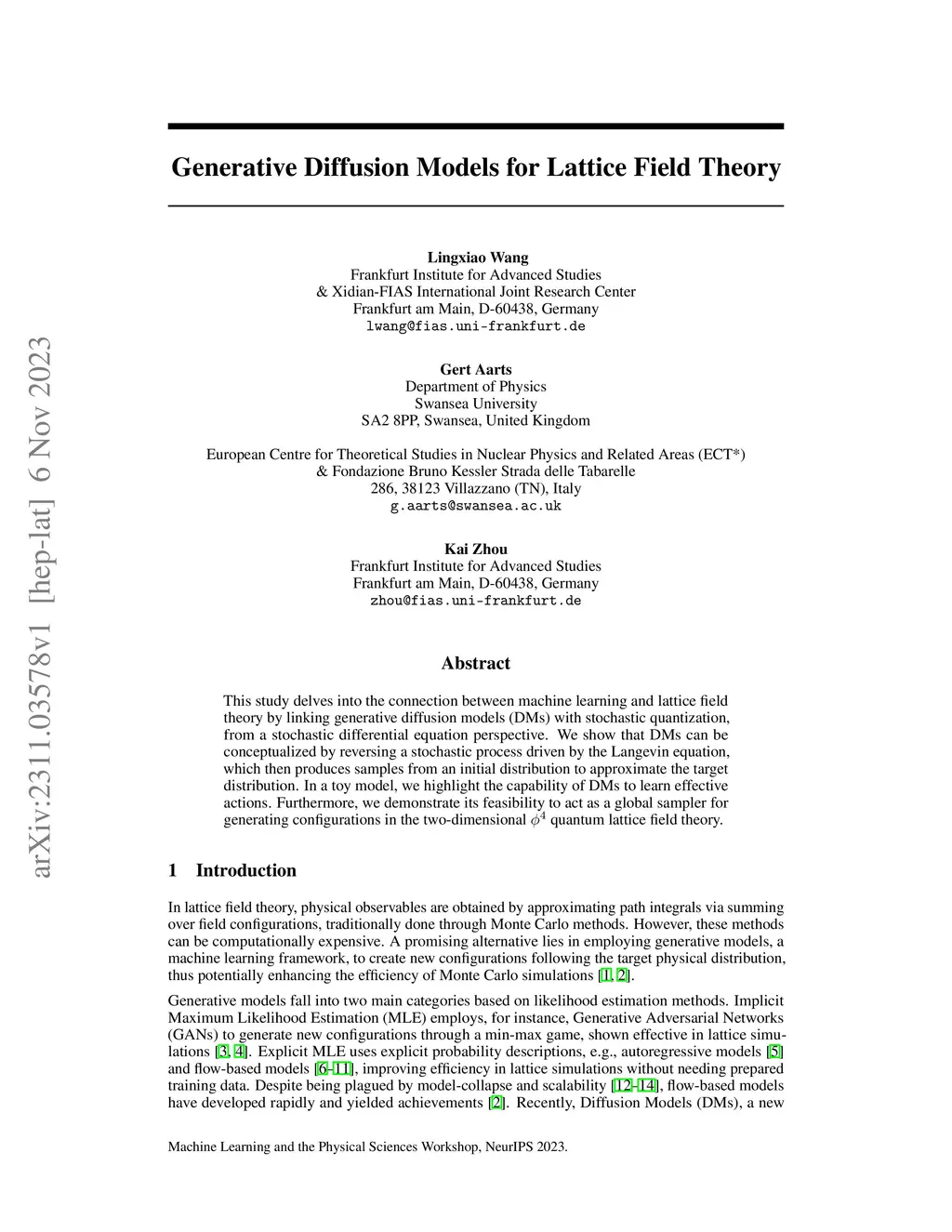 This study delves into the connection between machine learning and lattice field theory by linking generative diffusion models (DMs) with stochastic quantization, from a stochastic differential equation perspective. We show that DMs can be conceptualized by reversing a stochastic process driven by the Langevin equation, which then produces samples from an initial distribution to approximate the target distribution. In a toy model, we highlight the capability of DMs to learn effective actions. Furthermore, we demonstrate its feasibility to act as a global sampler for generating configurations in the two-dimensional quantum lattice field theory.