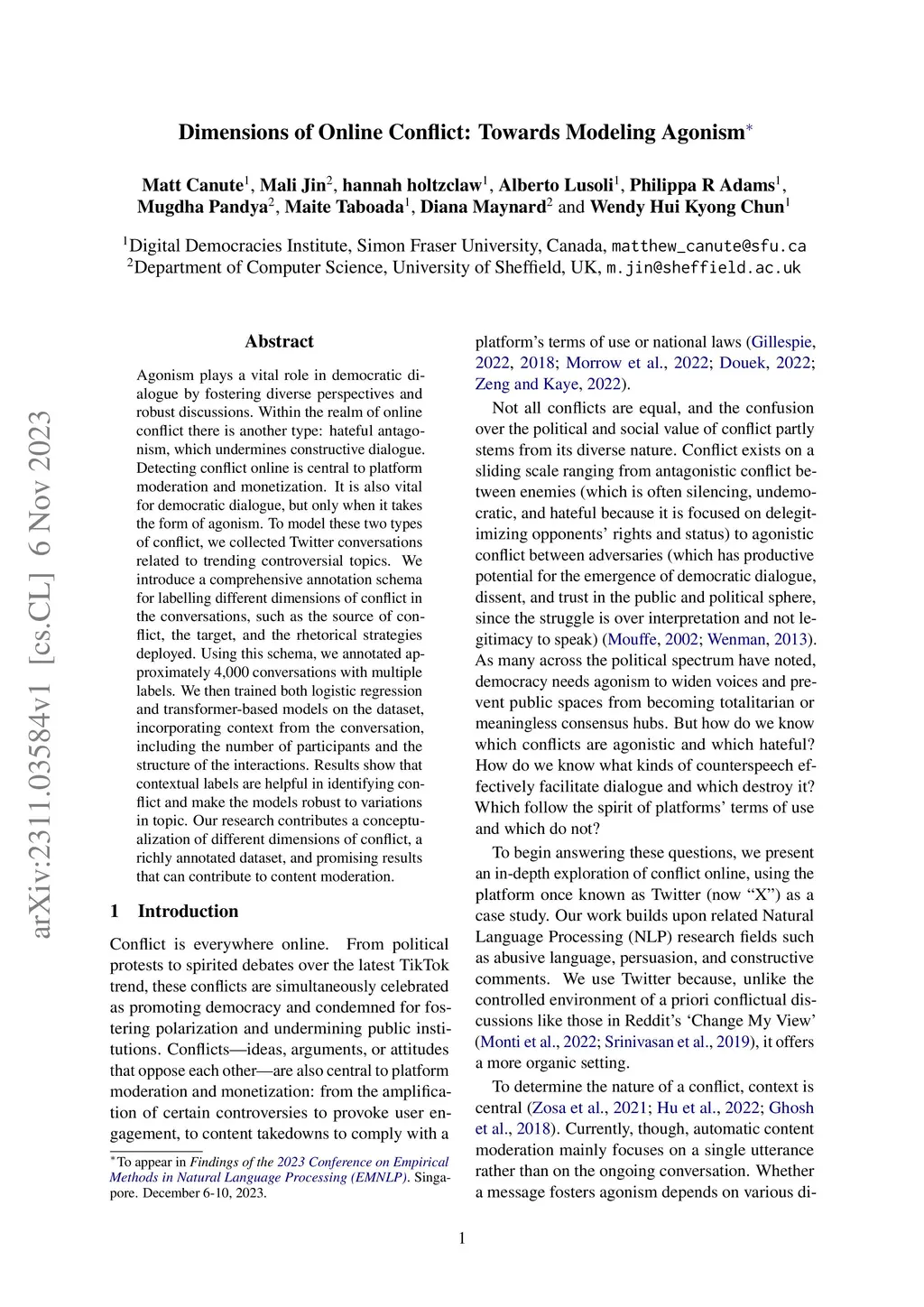 Agonism plays a vital role in democratic dialogue by fostering diverse perspectives and robust discussions. Within the realm of online conflict there is another type: hateful antagonism, which undermines constructive dialogue. Detecting conflict online is central to platform moderation and monetization. It is also vital for democratic dialogue, but only when it takes the form of agonism. To model these two types of conflict, we collected Twitter conversations related to trending controversial topics. We introduce a comprehensive annotation schema for labelling different dimensions of conflict in the conversations, such as the source of conflict, the target, and the rhetorical strategies deployed. Using this schema, we annotated approximately 4,000 conversations with multiple labels. We then trained both logistic regression and transformer-based models on the dataset, incorporating context from the conversation, including the number of participants and the structure of the interactions. Results show that contextual labels are helpful in identifying conflict and make the models robust to variations in topic. Our research contributes a conceptualization of different dimensions of conflict, a richly annotated dataset, and promising results that can contribute to content moderation.