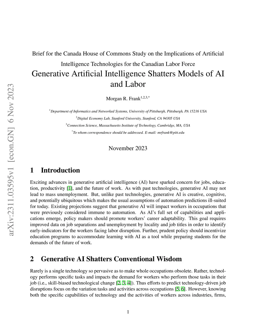 Exciting advances in generative artificial intelligence (AI) have sparked concern for jobs, education, productivity, and the future of work. As with past technologies, generative AI may not lead to mass unemployment. But, unlike past technologies, generative AI is creative, cognitive, and potentially ubiquitous which makes the usual assumptions of automation predictions ill-suited for today. Existing projections suggest that generative AI will impact workers in occupations that were previously considered immune to automation. As AI's full set of capabilities and applications emerge, policy makers should promote workers' career adaptability. This goal requires improved data on job separations and unemployment by locality and job titles in order to identify early-indicators for the workers facing labor disruption. Further, prudent policy should incentivize education programs to accommodate learning with AI as a tool while preparing students for the demands of the future of work.