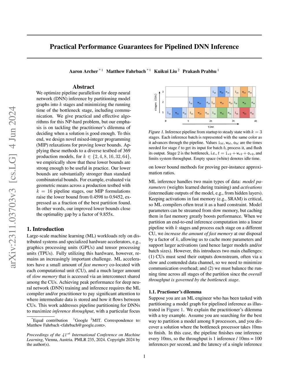 We optimize pipeline parallelism for deep neural network (DNN) inference by partitioning model graphs into stages and minimizing the running time of the bottleneck stage, including communication. We give practical and effective algorithms for this NP-hard problem, but our emphasis is on tackling the practitioner's dilemma of deciding when a solution is good enough. To this end, we design novel mixed-integer programming (MIP) relaxations for proving lower bounds. Applying these methods to a diverse testbed of 369 production models, for , we empirically show that these lower bounds are strong enough to be useful in practice. Our lower bounds are substantially stronger than standard combinatorial bounds. For example, evaluated via geometric means across a production testbed with pipeline stages, our MIP formulations raise the lower bound from 0.4598 to 0.9452, expressed as a fraction of the best partition found. In other words, our improved lower bounds close the optimality gap by a factor of 9.855x.